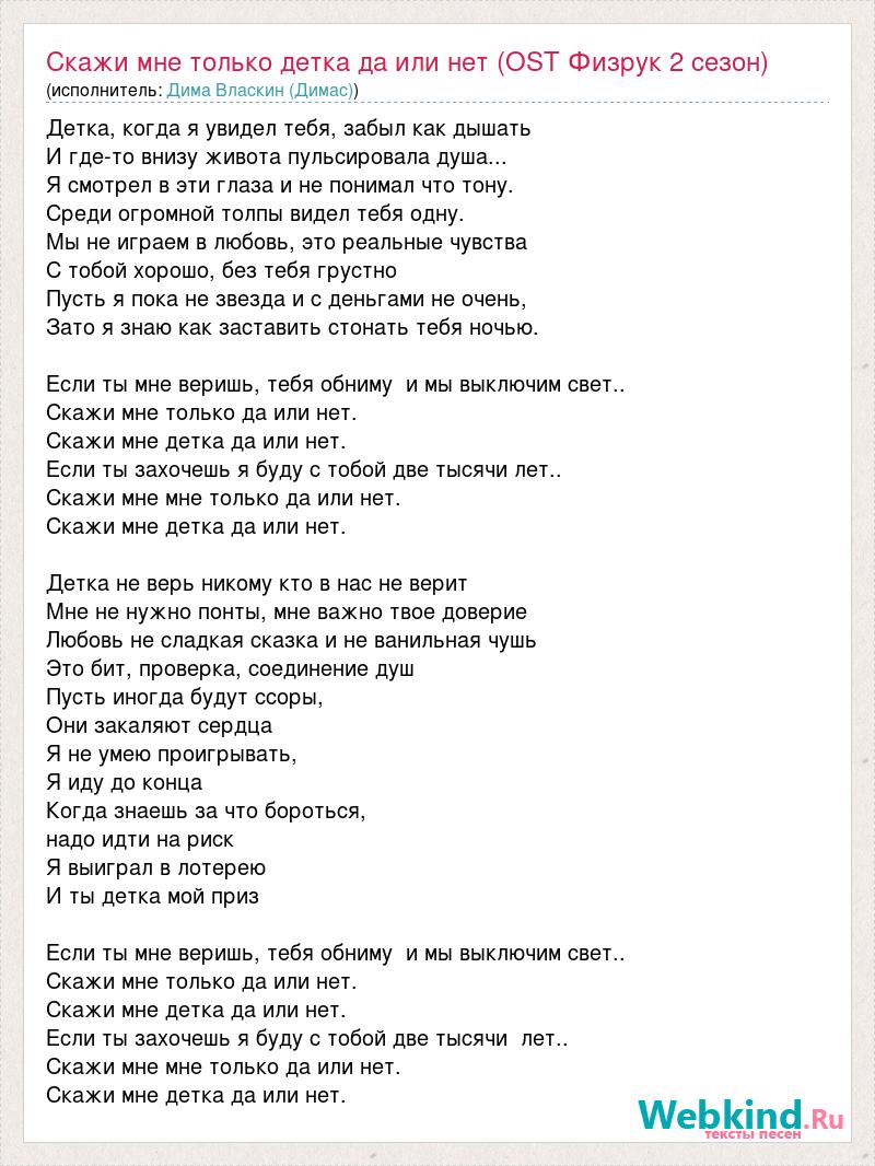 Детка, когда я увидел тебя, забыл как дышать И где-то внизу живота пульсировала душа... Я смотрел в эти глаза и не понимал что тону. Среди огромной толпы видел тебя одну. Мы не играем в любовь, это реальные чувства С тобой хорошо, без тебя грустно Пусть я пока не звезда и с деньгами не очень, Зато я знаю как заставить стонать тебя ночью. Если ты мне веришь, тебя обниму и мы выключим свет.. Скажи мне только да или нет. Скажи мне детка да или нет. Если ты захочешь я буду с тобой две тысячи лет.. Скажи мне мне только да или нет. Скажи мне детка да или нет. Детка не верь никому кто в нас не верит Мне не нужно понты, мне важно твое доверие Любовь не сладкая сказка и не ванильная чушь Это бит, проверка, соединение душ Пусть иногда будут ссоры, Они закаляют сердца Я не умею проигрывать, Я иду до конца Когда знаешь за что бороться, надо идти на риск Я выиграл в лотерею И ты детка мой приз Если ты мне веришь, тебя обниму и мы выключим свет.. Скажи мне только да или нет. Скажи мне детка да или нет. Если ты захочешь я буду с тобой две тысячи лет.. Скажи мне мне только да или нет. Скажи мне детка да или нет.