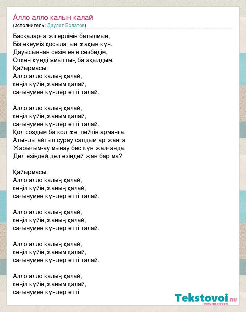 Басқаларға жігерлімін батылмын, Біз екеуміз қосылатын жақын күн. Дауысыңнан сезім әнін сезбедім, Өткен күнді ұмыттың ба ақылдым. Қайырмасы: Алло алло қалың қалай, көңіл күйің,жаным қалай, сағынумен күндер өтті талай. Алло алло қалың қалай, көңіл күйің,жаным қалай, сағынумен күндер өтті талай. Қол создым ба қол жетпейтін арманға, Атынды айтып сурау салдым ар жанга Жарығым-ау мынау бес күн жалғанда, Дәл өзіңдей,дәл өзіңдей жан бар ма? Қайырмасы: Алло алло қалың қалай, көңіл күйің,жаның қалай, сағынумен күндер өтті талай. Алло алло қалың қалай, көңіл күйің,жаның қалай, сағынумен күндер өтті талай. Алло алло қалың қалай, көңіл күйің,жаным қалай, сағынумен күндер өтті талай. Алло алло қалың қалай, көңіл күйің,жаным қалай, сағынумен күндер өтті