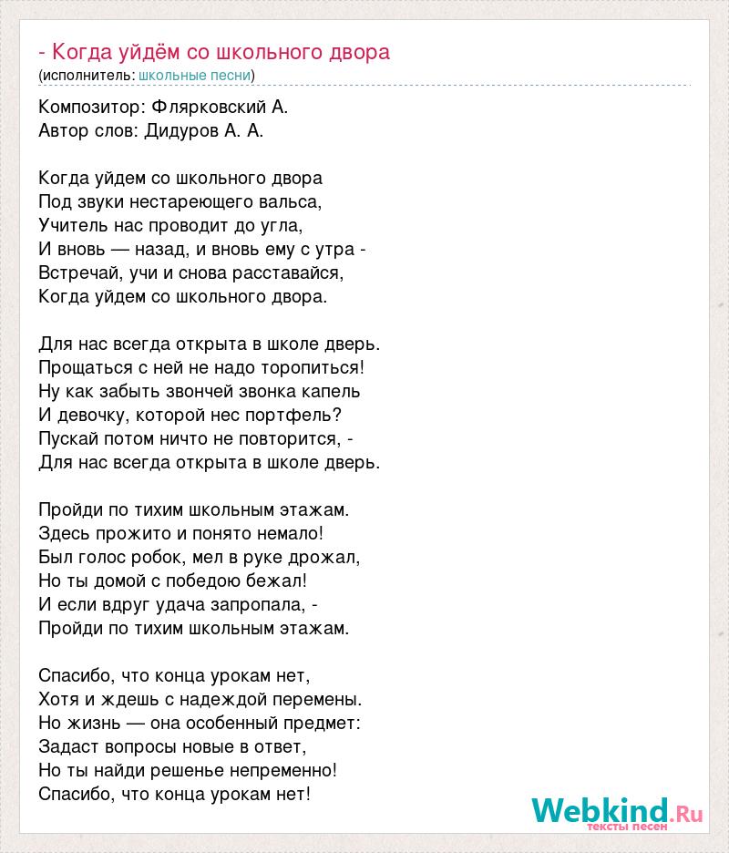 Композитор: Флярковский А. Автор слов: Дидуров А. А. Когда уйдем со школьного двора Под звуки нестареющего вальса, Учитель нас проводит до угла, И вновь — назад, и вновь ему с утра - Встречай, учи и снова расставайся, Когда уйдем со школьного двора. Для нас всегда открыта в школе дверь. Прощаться с ней не надо торопиться! Ну как забыть звончей звонка капель И девочку, которой нес портфель? Пускай потом ничто не повторится, - Для нас всегда открыта в школе дверь. Пройди по тихим школьным этажам. Здесь прожито и понято немало! Был голос робок, мел в руке дрожал, Но ты домой с победою бежал! И если вдруг удача запропала, - Пройди по тихим школьным этажам. Спасибо, что конца урокам нет, Хотя и ждешь с надеждой перемены. Но жизнь — она особенный предмет: Задаст вопросы новые в ответ, Но ты найди решенье непременно! Спасибо, что конца урокам нет!