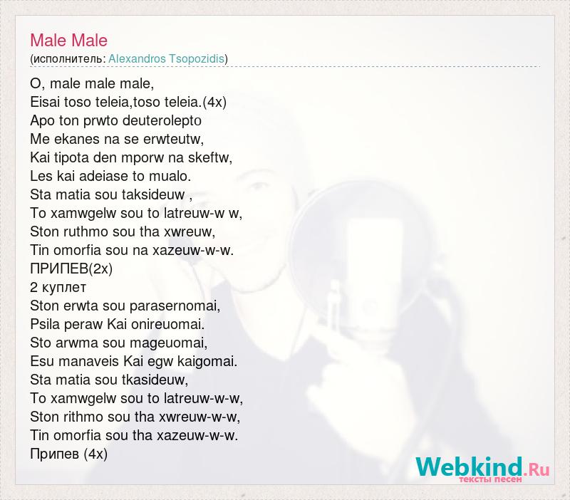 O, male male male, Eisai toso teleia,toso teleia.(4x) Apo ton prwto deuteroleptο Me ekanes na se erwteutw, Kai tipota den mporw na skeftw, Les kai adeiase to mualо. Sta matia sou taksideuw , To xamwgelw sou to latreuw-w w, Ston ruthmo sou tha xwreuw, Tin omorfia sou na xazeuw-w-w. ПРИПЕВ(2х) 2 куплет Ston erwta sou parasernomai, Psila peraw Kai onireuomai. Sto arwma sou mageuomai, Esu manaveis Kai egw kaigomai. Sta matia sou tkasideuw, To xamwgelw sou to latreuw-w-w, Ston rithmo sou tha xwreuw-w-w, Tin omorfia sou tha xazeuw-w-w. Припев (4х)