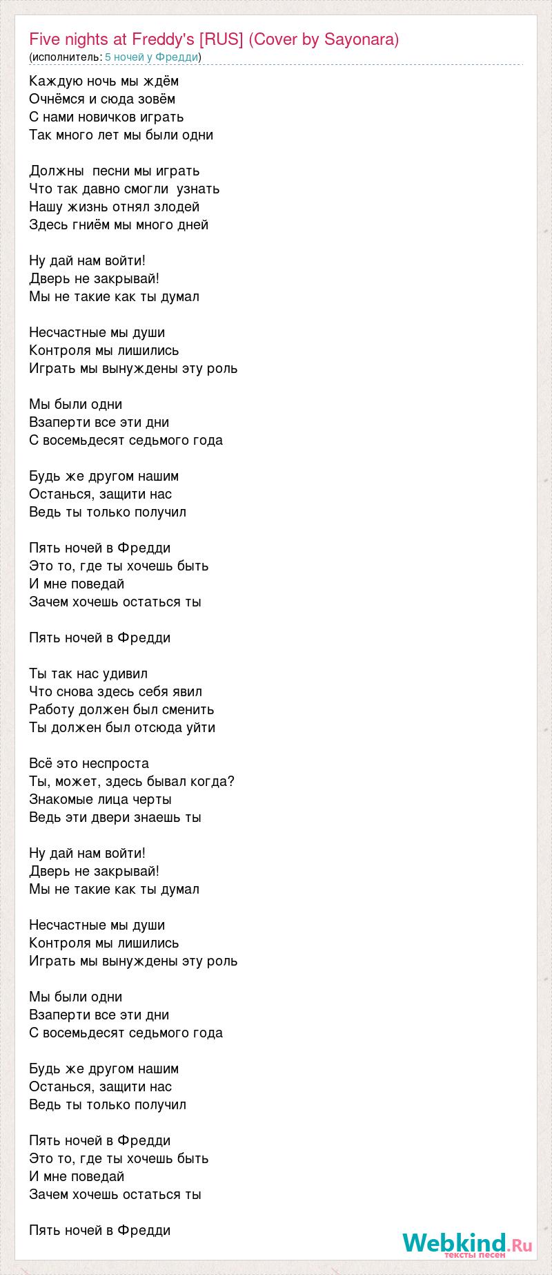 Каждую ночь мы ждём Очнёмся и сюда зовём С нами новичков играть Так много лет мы были одни Должны песни мы играть Что так давно смогли узнать Нашу жизнь отнял злодей Здесь гниём мы много дней Ну дай нам войти! Дверь не закрывай! Мы не такие как ты думал Несчастные мы души Контроля мы лишились Играть мы вынуждены эту роль Мы были одни Взаперти все эти дни С восемьдесят седьмого года Будь же другом нашим Останься, защити нас Ведь ты только получил Пять ночей в Фредди Это то, где ты хочешь быть И мне поведай Зачем хочешь остаться ты Пять ночей в Фредди Ты так нас удивил Что снова здесь себя явил Работу должен был сменить Ты должен был отсюда уйти Всё это неспроста Ты, может, здесь бывал когда? Знакомые лица черты Ведь эти двери знаешь ты Ну дай нам войти! Дверь не закрывай! Мы не такие как ты думал Несчастные мы души Контроля мы лишились Играть мы вынуждены эту роль Мы были одни Взаперти все эти дни С восемьдесят седьмого года Будь же другом нашим Останься, защити нас Ведь ты только получил Пять ночей в Фредди Это то, где ты хочешь быть И мне поведай Зачем хочешь остаться ты Пять ночей в Фредди