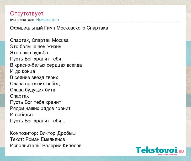 Официальный Гимн Московского Спартака Спартак, Спартак Москва Это больше чем жизнь Это наша судьба Пусть Бог хранит тебя В красно-белых сердцах всегда И до конца В сеяние звезд твоих Слава прежних побед Слава будущих битв Спартак Пусть Бог тебя хранит Рядом наших рядов гранит И победит Пусть Бог хранит тебя... Композитор: Виктор Дробыш Текст: Роман Емельянов Исполнитель: Валерий Кипелов