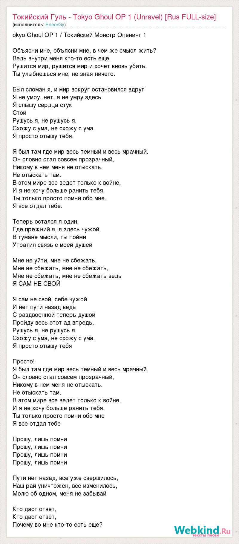 okyo Ghoul OP 1 / Токийский Монстр Опенинг 1 Объясни мне, объясни мне, в чем же смысл жить? Ведь внутри меня кто-то есть еще. Рушится мир, рушится мир и хочет вновь убить. Ты улыбнешься мне, не зная ничего. Был сломан я, и мир вокруг остановился вдруг Я не умру, нет, я не умру здесь Я слышу сердца стук Стой Рушусь я, не рушусь я. Схожу с ума, не схожу с ума. Я просто отыщу тебя. Я был там где мир весь темный и весь мрачный. Он словно стал совсем прозрачный, Никому в нем меня не отыскать. Не отыскать там. В этом мире все ведет только к войне, И я не хочу больше ранить тебя. Ты только просто помни обо мне. Я все отдал тебе. Теперь остался я один, Где прежний я, я здесь чужой, В тумане мысли, ты пойми Утратил связь с моей душей Мне не уйти, мне не сбежать, Мне не сбежать, мне не cбежать, Мне не сбежать, мне не сбежать ведь Я САМ НЕ СВОЙ Я сам не свой, себе чужой И нет пути назад ведь С раздвоенной теперь душой Пройду весь этот ад впредь, Рушусь я, не рушусь я. Схожу с ума, не схожу с ума. Я просто отыщу тебя Просто! Я был там где мир весь темный и весь мрачный. Он словно стал совсем прозрачный, Никому в нем меня не отыскать. Не отыскать там. В этом мире все ведет только к войне, И я не хочу больше ранить тебя. Ты только просто помни обо мне Я все отдал тебе Прошу, лишь помни Прошу, лишь помни Прошу, лишь помни Прошу, лишь помни Пути нет назад, все уже свершилось, Наш рай уничтожен, все изменилось, Молю об одном, меня не забывай Кто даст ответ, Кто даст ответ, Почему во мне кто-то есть еще?