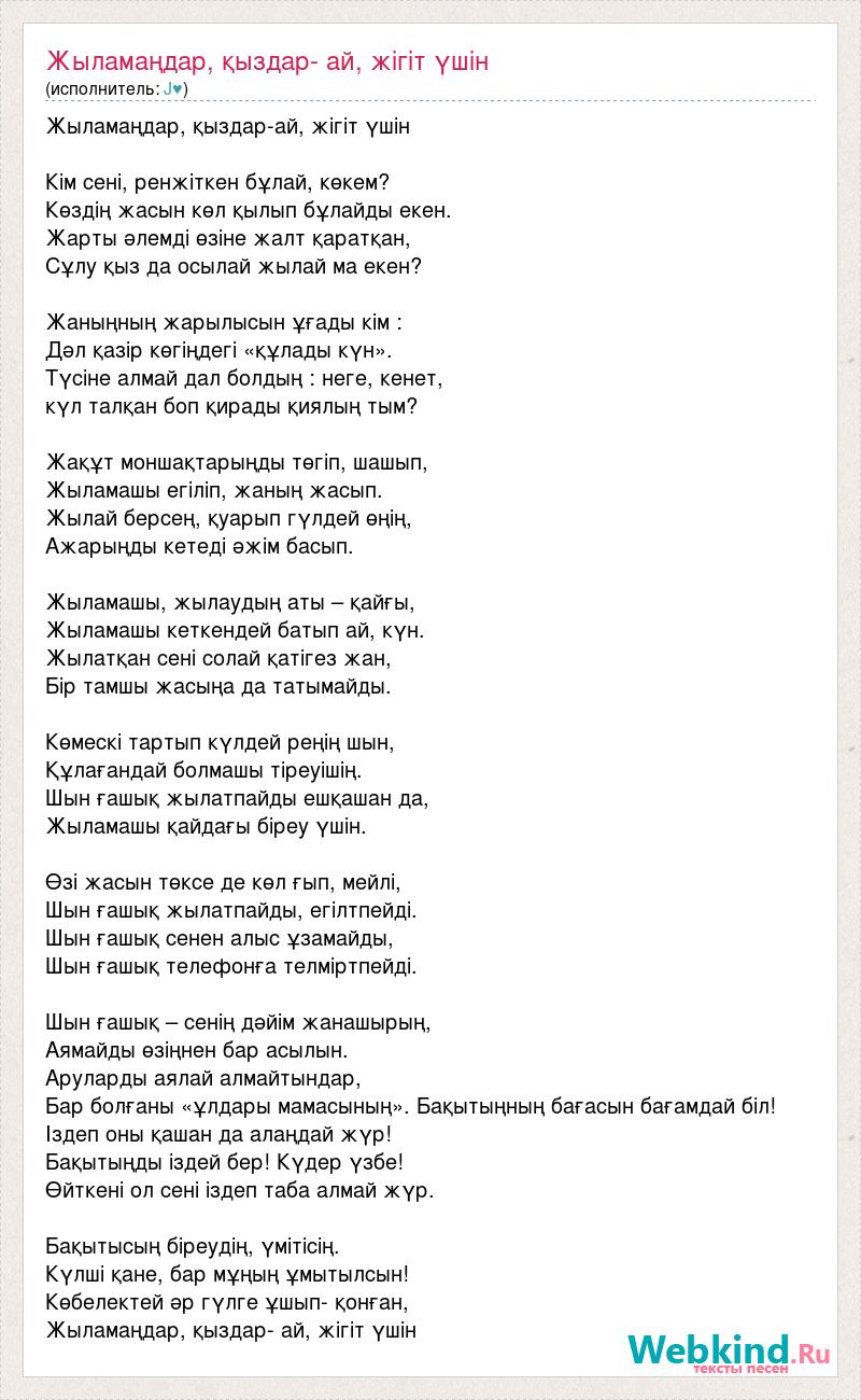 Жыламаңдар, қыздар-ай, жігіт үшін Кім сені, ренжіткен бұлай, көкем? Көздің жасын көл қылып бұлайды екен. Жарты әлемді өзіне жалт қаратқан, Сұлу қыз да осылай жылай ма екен? Жаныңның жарылысын ұғады кім : Дәл қазір көгіңдегі «құлады күн». Түсіне алмай дал болдың : неге, кенет, күл талқан боп қирады қиялың тым? Жақұт моншақтарыңды төгіп, шашып, Жыламашы егіліп, жаның жасып. Жылай берсең, қуарып гүлдей өңің, Ажарыңды кетеді әжім басып. Жыламашы, жылаудың аты – қайғы, Жыламашы кеткендей батып ай, күн. Жылатқан сені солай қатігез жан, Бір тамшы жасыңа да татымайды. Көмескі тартып күлдей реңің шын, Құлағандай болмашы тіреуішің. Шын ғашық жылатпайды ешқашан да, Жыламашы қайдағы біреу үшін. Өзі жасын төксе де көл ғып, мейлі, Шын ғашық жылатпайды, егілтпейді. Шын ғашық сенен алыс ұзамайды, Шын ғашық телефонға телміртпейді. Шын ғашық – сенің дәйім жанашырың, Аямайды өзіңнен бар асылын. Аруларды аялай алмайтындар, Бар болғаны «ұлдары мамасының». Бақытыңның бағасын бағамдай біл! Іздеп оны қашан да алаңдай жүр! Бақытыңды іздей бер! Күдер үзбе! Өйткені ол сені іздеп таба алмай жүр. Бақытысың біреудің, үмітісің. Күлші қане, бар мұңың ұмытылсын! Көбелектей әр гүлге ұшып- қонған, Жыламаңдар, қыздар- ай, жігіт үшін