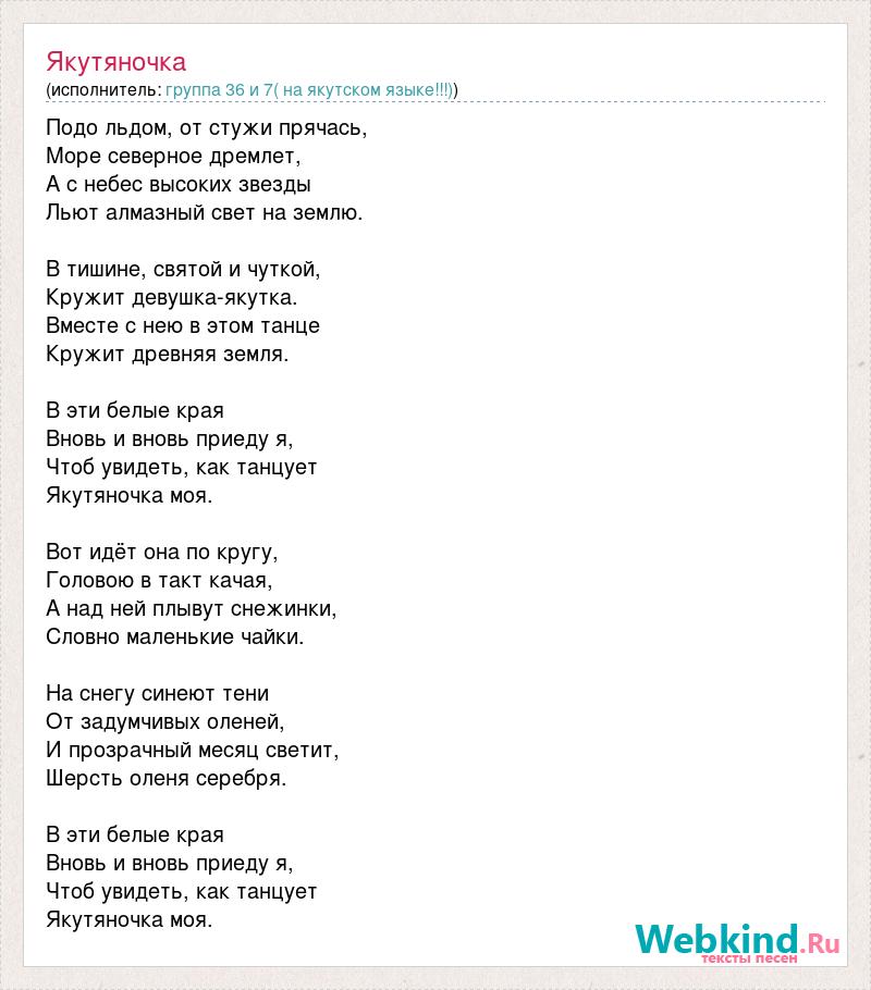 Подо льдом, от стужи прячась, Море северное дремлет, А с небес высоких звезды Льют алмазный свет на землю. В тишине, святой и чуткой, Кружит девушка-якутка. Вместе с нею в этом танце Кружит древняя земля. В эти белые края Вновь и вновь приеду я, Чтоб увидеть, как танцует Якутяночка моя. Вот идёт она по кругу, Головою в такт качая, А над ней плывут снежинки, Словно маленькие чайки. На снегу синеют тени От задумчивых оленей, И прозрачный месяц светит, Шерсть оленя серебря. В эти белые края Вновь и вновь приеду я, Чтоб увидеть, как танцует Якутяночка моя.