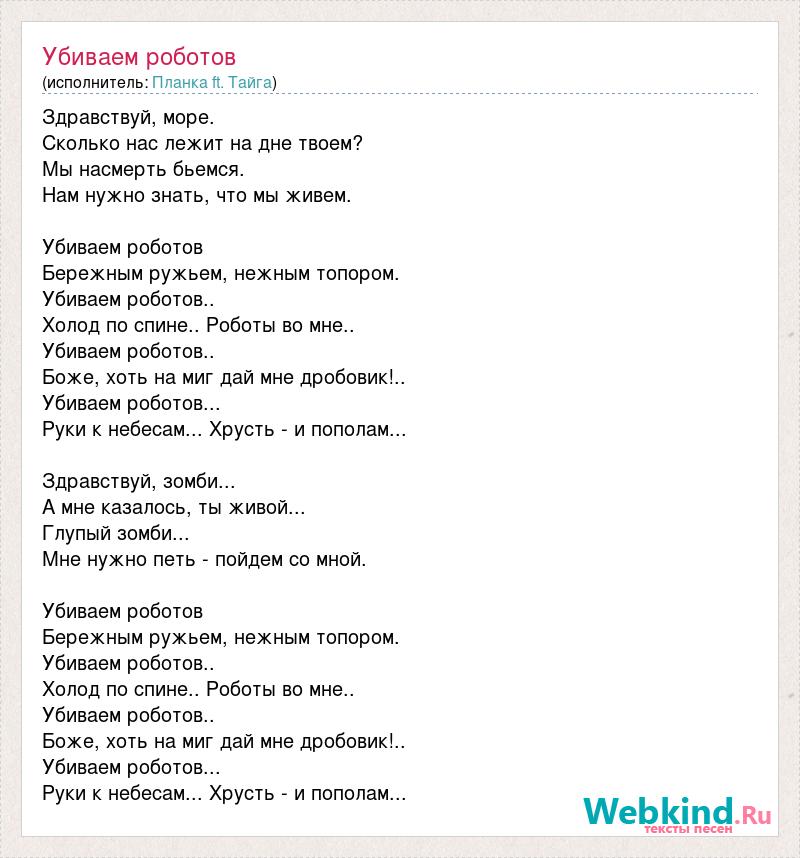 Здравствуй, море. Сколько нас лежит на дне твоем? Мы насмерть бьемся. Нам нужно знать, что мы живем. Убиваем роботов Бережным ружьем, нежным топором. Убиваем роботов.. Холод по спине.. Роботы во мне.. Убиваем роботов.. Боже, хоть на миг дай мне дробовик!.. Убиваем роботов... Руки к небесам... Хрусть - и пополам... Здравствуй, зомби... А мне казалось, ты живой... Глупый зомби... Мне нужно петь - пойдем со мной. Убиваем роботов Бережным ружьем, нежным топором. Убиваем роботов.. Холод по спине.. Роботы во мне.. Убиваем роботов.. Боже, хоть на миг дай мне дробовик!.. Убиваем роботов... Руки к небесам... Хрусть - и пополам...