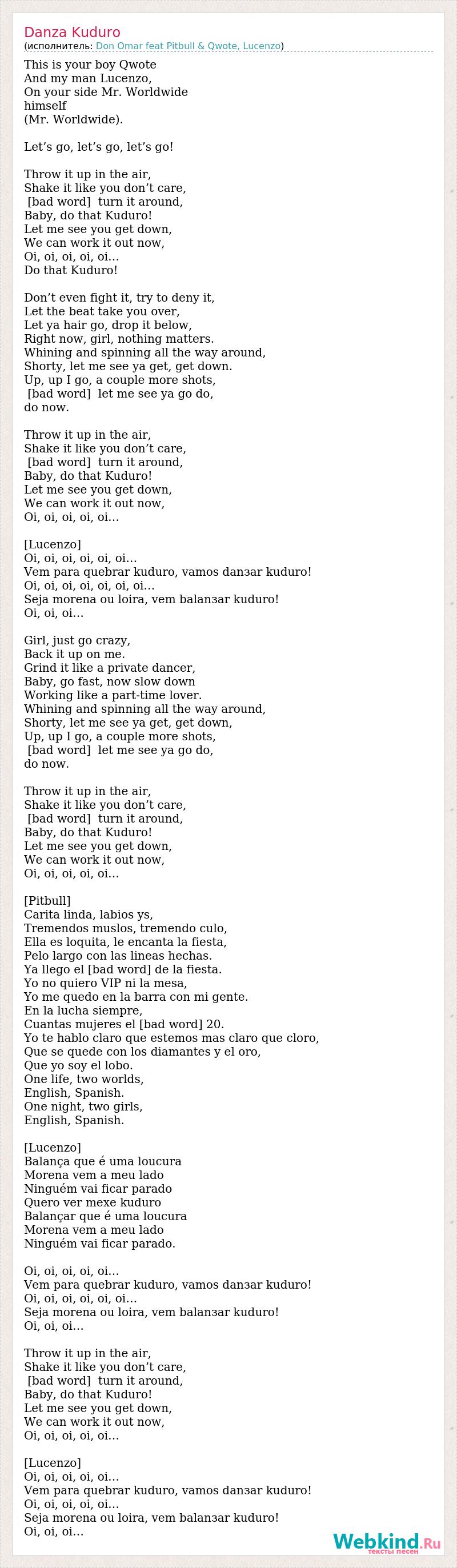 This is your boy Qwote And my man Lucenzo, On your side Mr. Worldwide himself (Mr. Worldwide). Let’s go, let’s go, let’s go! Throw it up in the air, Shake it like you don’t care, [bad word] turn it around, Baby, do that Kuduro! Let me see you get down, We can work it out now, Oi, oi, oi, oi, oi… Do that Kuduro! Don’t even fight it, try to deny it, Let the beat take you over, Let ya hair go, drop it below, Right now, girl, nothing matters. Whining and spinning all the way around, Shorty, let me see ya get, get down. Up, up I go, a couple more shots, [bad word] let me see ya go do, do now. Throw it up in the air, Shake it like you don’t care, [bad word] turn it around, Baby, do that Kuduro! Let me see you get down, We can work it out now, Oi, oi, oi, oi, oi… [Lucenzo] Oi, oi, oi, oi, oi, oi… Vem para quebrar kuduro, vamos danзar kuduro! Oi, oi, oi, oi, oi, oi, oi… Seja morena ou loira, vem balanзar kuduro! Oi, oi, oi… Girl, just go crazy, Back it up on me. Grind it like a private dancer, Baby, go fast, now slow down Working like a part-time lover. Whining and spinning all the way around, Shorty, let me see ya get, get down, Up, up I go, a couple more shots, [bad word] let me see ya go do, do now. Throw it up in the air, Shake it like you don’t care, [bad word] turn it around, Baby, do that Kuduro! Let me see you get down, We can work it out now, Oi, oi, oi, oi, oi… [Pitbull] Carita linda, labios ys, Tremendos muslos, tremendo culo, Ella es loquita, le encanta la fiesta, Pelo largo con las lineas hechas. Ya llego el [bad word] de la fiesta. Yo no quiero VIP ni la mesa, Yo me quedo en la barra con mi gente. En la lucha siempre, Cuantas mujeres el [bad word] 20. Yo te hablo claro que estemos mas claro que cloro, Que se quede con los diamantes y el oro, Que yo soy el lobo. One life, two worlds, English, Spanish. One night, two girls, English, Spanish. [Lucenzo] Balança que é uma loucura Morena vem a meu lado Ninguém vai ficar parado Quero ver mexe kuduro Balançar que é uma loucura Morena vem a meu lado Ninguém vai ficar parado. Oi, oi, oi, oi, oi… Vem para quebrar kuduro, vamos danзar kuduro! Oi, oi, oi, oi, oi, oi… Seja morena ou loira, vem balanзar kuduro! Oi, oi, oi… Throw it up in the air, Shake it like you don’t care, [bad word] turn it around, Baby, do that Kuduro! Let me see you get down, We can work it out now, Oi, oi, oi, oi, oi… [Lucenzo] Oi, oi, oi, oi, oi… Vem para quebrar kuduro, vamos danзar kuduro! Oi, oi, oi, oi, oi… Seja morena ou loira, vem balanзar kuduro! Oi, oi, oi…