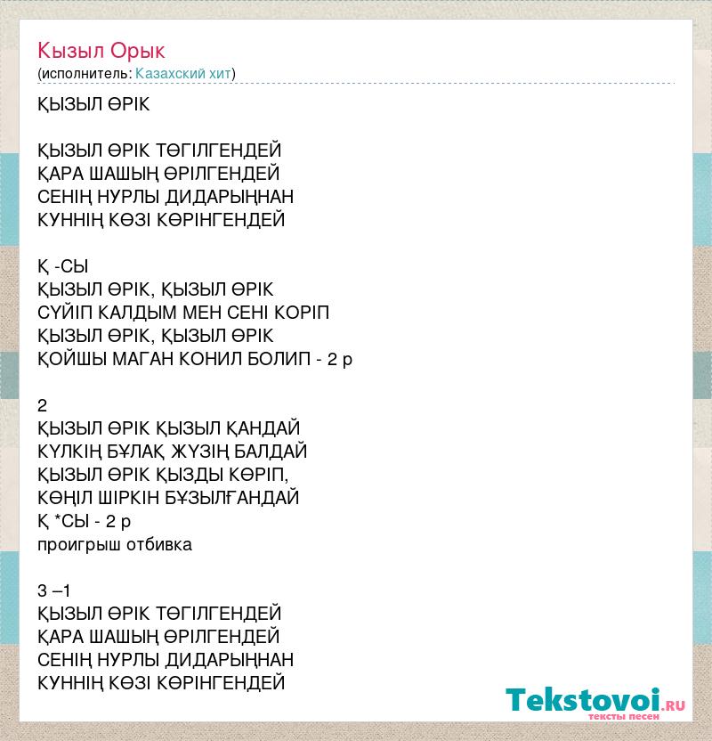 ҚЫЗЫЛ ӨРІК ҚЫЗЫЛ ӨРІК ТӨГІЛГЕНДЕЙ ҚАРА ШАШЫҢ ӨРІЛГЕНДЕЙ СЕНІҢ НУРЛЫ ДИДАРЫҢНАН КУННІҢ КӨЗІ КӨРІНГЕНДЕЙ Қ -СЫ ҚЫЗЫЛ ӨРІК, ҚЫЗЫЛ ӨРІК СҮЙIП КАЛДЫМ МЕН СЕНI КОРIП ҚЫЗЫЛ ӨРІК, ҚЫЗЫЛ ӨРІК ҚОЙШЫ МАГАН КОНИЛ БОЛИП - 2 р 2 ҚЫЗЫЛ ӨРІК ҚЫЗЫЛ ҚАНДАЙ КҮЛКІҢ БҰЛАҚ ЖҮЗІҢ БАЛДАЙ ҚЫЗЫЛ ӨРІК ҚЫЗДЫ КӨРІП, КӨҢІЛ ШІРКІН БҰЗЫЛҒАНДАЙ Қ *СЫ - 2 р проигрыш отбивка 3 –1 ҚЫЗЫЛ ӨРІК ТӨГІЛГЕНДЕЙ ҚАРА ШАШЫҢ ӨРІЛГЕНДЕЙ СЕНІҢ НУРЛЫ ДИДАРЫҢНАН КУННІҢ КӨЗІ КӨРІНГЕНДЕЙ