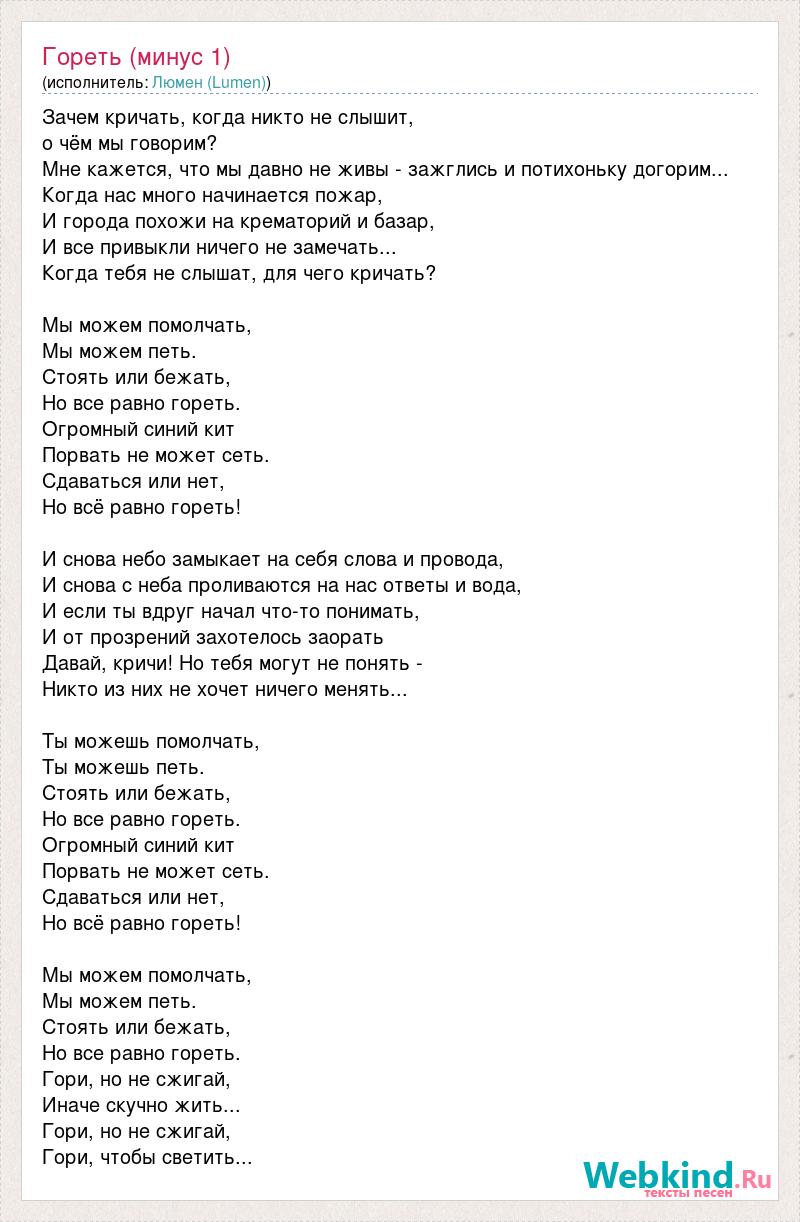 Зачем кричать, когда никто не слышит, о чём мы говорим? Мне кажется, что мы давно не живы - зажглись и потихоньку догорим... Когда нас много начинается пожар, И города похожи на крематорий и базар, И все привыкли ничего не замечать... Когда тебя не слышат, для чего кричать? Мы можем помолчать, Мы можем петь. Стоять или бежать, Но все равно гореть. Огромный синий кит Порвать не может сеть. Сдаваться или нет, Но всё равно гореть! И снова небо замыкает на себя слова и провода, И снова с неба проливаются на нас ответы и вода, И если ты вдруг начал что-то понимать, И от прозрений захотелось заорать Давай, кричи! Но тебя могут не понять - Никто из них не хочет ничего менять... Ты можешь помолчать, Ты можешь петь. Стоять или бежать, Но все равно гореть. Огромный синий кит Порвать не может сеть. Сдаваться или нет, Но всё равно гореть! Мы можем помолчать, Мы можем петь. Стоять или бежать, Но все равно гореть. Гори, но не сжигай, Иначе скучно жить... Гори, но не сжигай, Гори, чтобы светить...