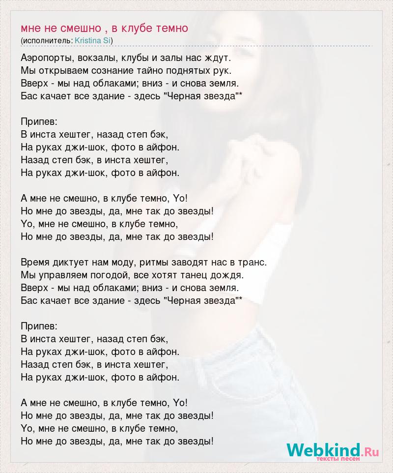 Аэропорты, вокзалы, клубы и залы нас ждут. Мы открываем сознание тайно поднятых рук. Вверх - мы над облаками; вниз - и снова земля. Бас качает все здание - здесь "Черная звезда"* Припев: В инста хештег, назад степ бэк, На руках джи-шок, фото в айфон. Назад степ бэк, в инста хештег, На руках джи-шок, фото в айфон. А мне не смешно, в клубе темно, Yo! Но мне до звезды, да, мне так до звезды! Yo, мне не смешно, в клубе темно, Но мне до звезды, да, мне так до звезды! Время диктует нам моду, ритмы заводят нас в транс. Мы управляем погодой, все хотят танец дождя. Вверх - мы над облаками; вниз - и снова земля. Бас качает все здание - здесь "Черная звезда"* Припев: В инста хештег, назад степ бэк, На руках джи-шок, фото в айфон. Назад степ бэк, в инста хештег, На руках джи-шок, фото в айфон. А мне не смешно, в клубе темно, Yo! Но мне до звезды, да, мне так до звезды! Yo, мне не смешно, в клубе темно, Но мне до звезды, да, мне так до звезды!