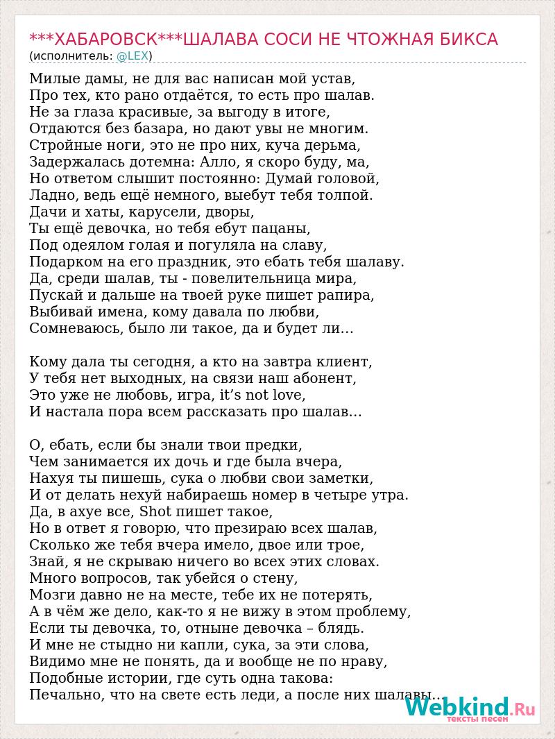 Милые дамы, не для вас написан мой устав, Про тех, кто рано отдаётся, то есть про шалав. Не за глаза красивые, за выгоду в итоге, Отдаются без базара, но дают увы не многим. Стройные ноги, это не про них, куча дерьма, Задержалась дотемна: Алло, я скоро буду, ма, Но ответом слышит постоянно: Думай головой, Ладно, ведь ещё немного, выебут тебя толпой. Дачи и хаты, карусели, дворы, Ты ещё девочка, но тебя ебут пацаны, Под одеялом голая и погуляла на славу, Подарком на его праздник, это ебать тебя шалаву. Да, среди шалав, ты - повелительница мира, Пускай и дальше на твоей руке пишет рапира, Выбивай имена, кому давала по любви, Сомневаюсь, было ли такое, да и будет ли… Кому дала ты сегодня, а кто на завтра клиент, У тебя нет выходных, на связи наш абонент, Это уже не любовь, игра, it’s not love, И настала пора всем рассказать про шалав… О, ебать, если бы знали твои предки, Чем занимается их дочь и где была вчера, Нахуя ты пишешь, сука о любви свои заметки, И от делать нехуй набираешь номер в четыре утра. Да, в ахуе все, Shot пишет такое, Но в ответ я говорю, что презираю всех шалав, Сколько же тебя вчера имело, двое или трое, Знай, я не скрываю ничего во всех этих словах. Много вопросов, так убейся о стену, Мозги давно не на месте, тебе их не потерять, А в чём же дело, как-то я не вижу в этом проблему, Если ты девочка, то, отныне девочка – блядь. И мне не стыдно ни капли, сука, за эти слова, Видимо мне не понять, да и вообще не по нраву, Подобные истории, где суть одна такова: Печально, что на свете есть леди, а после них шалавы…