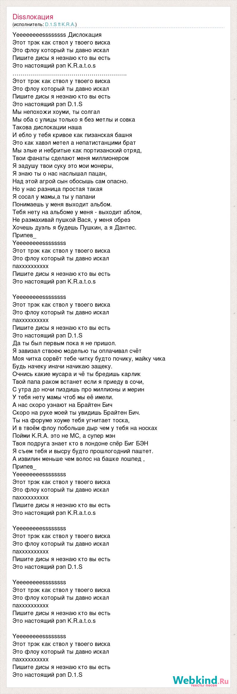 Yeeeeeeeessssssss Дислокация Этот трэк как ствол у твоего виска Это флоу который ты давно искал Пишите дисы я незнаю кто вы есть Это настоящий рэп K.R.a.t.o.s …………………………………………………. Этот трэк как ствол у твоего виска Это флоу который ты давно искал Пишите дисы я незнаю кто вы есть Это настоящий рэп D.1.S Мы непохожи хоуми, ты солгал Мы оба с улицы только я без метлы и совка Такова дислокации наша И ебло у тебя кривое как пизанская башня Это как хавэл метел а непатистанцими брат Мы злые и небритые как портизанский отряд, Твои фанаты сделают меня миллионером Я задушу твои суку это мои монеры, Я знаю ты о нас наслышал пацан, Над этой агрой сын обосышь сам опасно. Но у нас разница простая такая Я сосал у мамы,а ты у папани Понимаешь у меня выходит альбом. Тебя нету на альбоме у меня - выходит аблом, Не размахивай пушкой Вася, у меня обрез Хочешь дуэль я будешь Пушкин, а я Дантес. Припев_ Yeeeeeeeessssssss Этот трэк как ствол у твоего виска Это флоу который ты давно искал пахххххххххх Пишите дисы я незнаю кто вы есть Это настоящий рэп K.R.a.t.o.s Yeeeeeeeessssssss Этот трэк как ствол у твоего виска Это флоу который ты давно искал пахххххххххх Пишите дисы я незнаю кто вы есть Это настоящий рэп D.1.S Да ты был первым пока я не пришол. Я завизал ствоею моделью ты оплачивал счёт Моя читка сорвёт тебе читку будто почику, майку чика Будь начеку иначи начикаю защеку. Очнись какие мусара и чё ты бредишь карлик Твой папа раком встанет если я приеду в сочи, С утра до ночи пиздишь про миллионы и мерин У тебя нету мамы чтоб мы её имели. А нас скоро узнают на Брайтен Бич Скоро на руке моей ты увидишь Брайтен Бич. Ты на форуме хоуме тебя угнитает тоска, И в твоём флоу побольше дыр чем у тебя на носках Пойми K.R.A. это не MC, а супер мэн Твоя подруга знает кто в лондоне спёр Биг БЭН Я съем тебя и высру будто прошлогодний паштет. А извилин меньше чем волос на башке лошпед , Припев_ Yeeeeeeeessssssss Этот трэк как ствол у твоего виска Это флоу который ты давно искал пахххххххххх Пишите дисы я незнаю кто вы есть Это настоящий рэп K.R.a.t.o.s Yeeeeeeeessssssss Этот трэк как ствол у твоего виска Это флоу который ты давно искал пахххххххххх Пишите дисы я незнаю кто вы есть Это настоящий рэп D.1.S Yeeeeeeeessssssss Этот трэк как ствол у твоего виска Это флоу который ты давно искал пахххххххххх Пишите дисы я незнаю кто вы есть Это настоящий рэп K.R.a.t.o.s Yeeeeeeeessssssss Этот трэк как ствол у твоего виска Это флоу который ты давно искал пахххххххххх Пишите дисы я незнаю кто вы есть Это настоящий рэп D.1.S