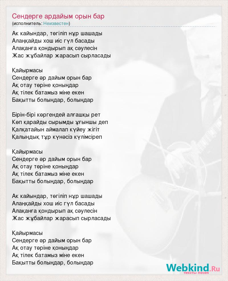 Ак кайындар, төгіліп нұр шашады Алаңқайды хош иіс гүл басады Алақанға қондырып ақ сәулесін Жас жұбайлар жарасып сырласады Қайырмасы Сендерге әр дайым орын бар Ақ отау төріне қоныңдар Ақ тілек батамыз міне екен Бақытты болыңдар, болыңдар Бірін-бірі көргендей алғашқы рет Көп қарайды сырымды ұғыншы деп Қалқатайын аймалап күйеу жігіт Қалыңдық тұр күнәсіз күлімсіреп Қайырмасы Сендерге әр дайым орын бар Ақ отау төріне қоныңдар Ақ тілек батамыз міне екен Бақытты болыңдар, болыңдар Ак кайындар, төгіліп нұр шашады Алаңқайды хош иіс гүл басады Алақанға қондырып ақ сәулесін Жас жұбайлар жарасып сырласады Қайырмасы Сендерге әр дайым орын бар Ақ отау төріне қоныңдар Ақ тілек батамыз міне екен Бақытты болыңдар, болыңдар