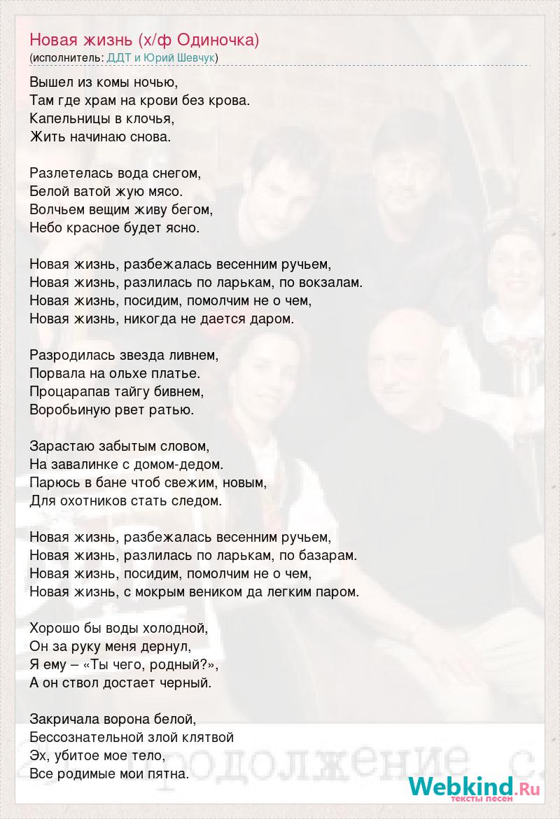Вышел из комы ночью, Там где храм на крови без крова. Капельницы в клочья, Жить начинаю снова. Разлетелась вода снегом, Белой ватой жую мясо. Волчьем вещим живу бегом, Небо красное будет ясно. Новая жизнь, разбежалась весенним ручьем, Новая жизнь, разлилась по ларькам, по вокзалам. Новая жизнь, посидим, помолчим не о чем, Новая жизнь, никогда не дается даром. Разродилась звезда ливнем, Порвала на ольхе платье. Процарапав тайгу бивнем, Воробьиную рвет ратью. Зарастаю забытым словом, На завалинке с домом-дедом. Парюсь в бане чтоб свежим, новым, Для охотников стать следом. Новая жизнь, разбежалась весенним ручьем, Новая жизнь, разлилась по ларькам, по базарам. Новая жизнь, посидим, помолчим не о чем, Новая жизнь, с мокрым веником да легким паром. Хорошо бы воды холодной, Он за руку меня дернул, Я ему – «Ты чего, родный?», А он ствол достает черный. Закричала ворона белой, Бессознательной злой клятвой Эх, убитое мое тело, Все родимые мои пятна.