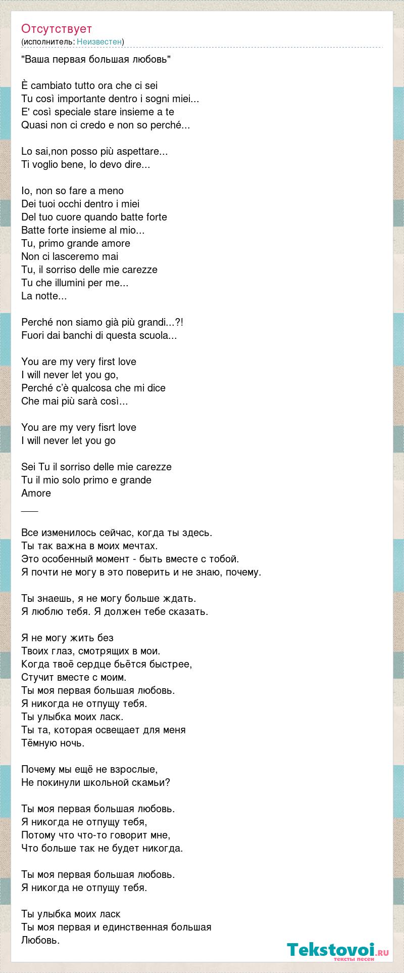 "Ваша первая большая любовь" È cambiato tutto ora che ci sei Tu così importante dentro i sogni miei... E' così speciale stare insieme a te Quasi non ci credo e non so perché... Lo sai,non posso più aspettare... Ti voglio bene, lo devo dire... Io, non so fare a meno Dei tuoi occhi dentro i miei Del tuo cuore quando batte forte Batte forte insieme al mio... Tu, primo grande amore Non ci lasceremo mai Tu, il sorriso delle mie carezze Tu che illumini per me... La notte... Perché non siamo già più grandi...?! Fuori dai banchi di questa scuola... You are my very first love I will never let you go, Perché c’è qualcosa che mi dice Che mai più sarà così... You are my very fisrt love I will never let you go Sei Tu il sorriso delle mie carezze Tu il mio solo primo e grande Amore ___ Все изменилось сейчас, когда ты здесь. Ты так важна в моих мечтах. Это особенный момент - быть вместе с тобой. Я почти не могу в это поверить и не знаю, почему. Ты знаешь, я не могу больше ждать. Я люблю тебя. Я должен тебе сказать. Я не могу жить без Твоих глаз, смотрящих в мои. Когда твоё сердце бьётся быстрее, Стучит вместе с моим. Ты моя первая большая любовь. Я никогда не отпущу тебя. Ты улыбка моих ласк. Ты та, которая освещает для меня Тёмную ночь. Почему мы ещё не взрослые, Не покинули школьной скамьи? Ты моя первая большая любовь. Я никогда не отпущу тебя, Потому что что-то говорит мне, Что больше так не будет никогда. Ты моя первая большая любовь. Я никогда не отпущу тебя. Ты улыбка моих ласк Ты моя первая и единственная большая Любовь.