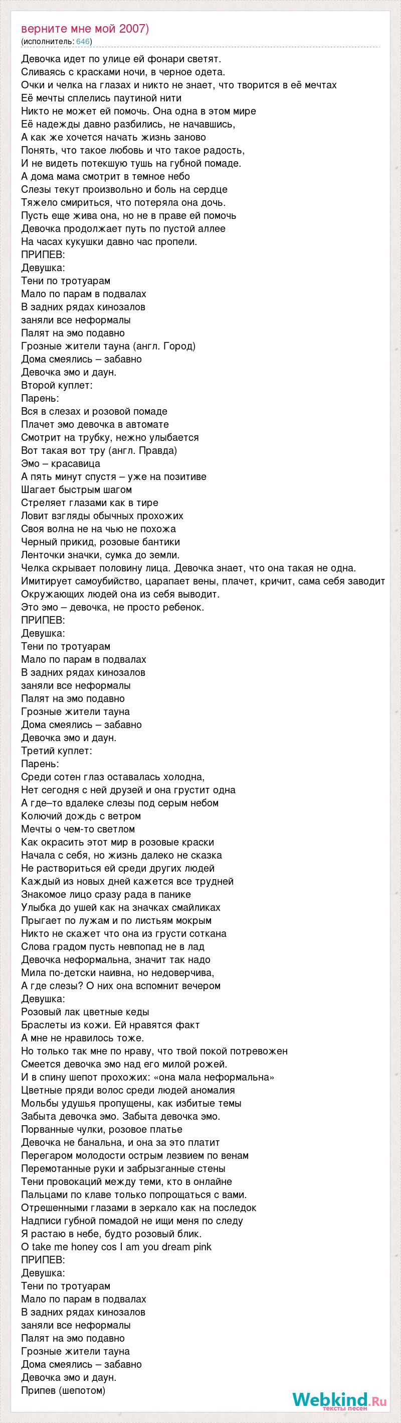 Девочка идет по улице ей фонари светят. Сливаясь с красками ночи, в черное одета. Очки и челка на глазах и никто не знает, что творится в её мечтах Её мечты сплелись паутиной нити Никто не может ей помочь. Она одна в этом мире Её надежды давно разбились, не начавшись, А как же хочется начать жизнь заново Понять, что такое любовь и что такое радость, И не видеть потекшую тушь на губной помаде. А дома мама смотрит в темное небо Слезы текут произвольно и боль на сердце Тяжело смириться, что потеряла она дочь. Пусть еще жива она, но не в праве ей помочь Девочка продолжает путь по пустой аллее На часах кукушки давно час пропели. ПРИПЕВ: Девушка: Тени по тротуарам Мало по парам в подвалах В задних рядах кинозалов заняли все неформалы Палят на эмо подавно Грозные жители тауна (англ. Город) Дома смеялись – забавно Девочка эмо и даун. Второй куплет: Парень: Вся в слезах и розовой помаде Плачет эмо девочка в автомате Смотрит на трубку, нежно улыбается Вот такая вот тру (англ. Правда) Эмо – красавица А пять минут спустя – уже на позитиве Шагает быстрым шагом Стреляет глазами как в тире Ловит взгляды обычных прохожих Своя волна не на чью не похожа Черный прикид, розовые бантики Ленточки значки, сумка до земли. Челка скрывает половину лица. Девочка знает, что она такая не одна. Имитирует самоубийство, царапает вены, плачет, кричит, сама себя заводит Окружающих людей она из себя выводит. Это эмо – девочка, не просто ребенок. ПРИПЕВ: Девушка: Тени по тротуарам Мало по парам в подвалах В задних рядах кинозалов заняли все неформалы Палят на эмо подавно Грозные жители тауна Дома смеялись – забавно Девочка эмо и даун. Третий куплет: Парень: Среди сотен глаз оставалась холодна, Нет сегодня с ней друзей и она грустит одна А где–то вдалеке слезы под серым небом Колючий дождь с ветром Мечты о чем-то светлом Как окрасить этот мир в розовые краски Начала с себя, но жизнь далеко не сказка Не раствориться ей среди других людей Каждый из новых дней кажется все трудней Знакомое лицо сразу рада в панике Улыбка до ушей как на значках смайликах Прыгает по лужам и по листьям мокрым Никто не скажет что она из грусти соткана Слова градом пусть невпопад не в лад Девочка неформальна, значит так надо Мила по-детски наивна, но недоверчива, А где слезы? О них она вспомнит вечером Девушка: Розовый лак цветные кеды Браслеты из кожи. Ей нравятся факт А мне не нравилось тоже. Но только так мне по нраву, что твой покой потревожен Смеется девочка эмо над его милой рожей. И в спину шепот прохожих: «она мала неформальна» Цветные пряди волос среди людей аномалия Мольбы удушья пропущены, как избитые темы Забыта девочка эмо. Забыта девочка эмо. Порванные чулки, розовое платье Девочка не банальна, и она за это платит Перегаром молодости острым лезвием по венам Перемотанные руки и забрызганные стены Тени провокаций между теми, кто в онлайне Пальцами по клаве только попрощаться с вами. Отрешенными глазами в зеркало как на последок Надписи губной помадой не ищи меня по следу Я растаю в небе, будто розовый блик. О take me honey cos I am you dream pink ПРИПЕВ: Девушка: Тени по тротуарам Мало по парам в подвалах В задних рядах кинозалов заняли все неформалы Палят на эмо подавно Грозные жители тауна Дома смеялись – забавно Девочка эмо и даун. Припев (шепотом)