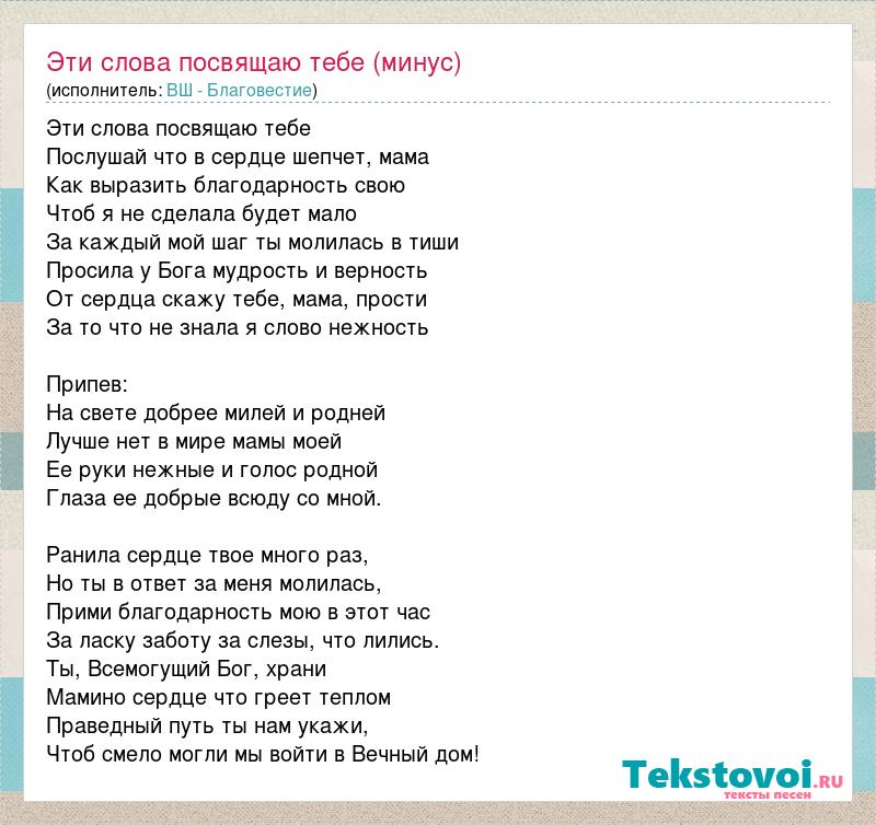 Эти слова посвящаю тебе Послушай что в сердце шепчет, мама Как выразить благодарность свою Чтоб я не сделала будет мало За каждый мой шаг ты молилась в тиши Просила у Бога мудрость и верность От сердца скажу тебе, мама, прости За то что не знала я слово нежность Припев: На свете добрее милей и родней Лучше нет в мире мамы моей Ее руки нежные и голос родной Глаза ее добрые всюду со мной. Ранила сердце твое много раз, Но ты в ответ за меня молилась, Прими благодарность мою в этот час За ласку заботу за слезы, что лились. Ты, Всемогущий Бог, храни Мамино сердце что греет теплом Праведный путь ты нам укажи, Чтоб смело могли мы войти в Вечный дом!