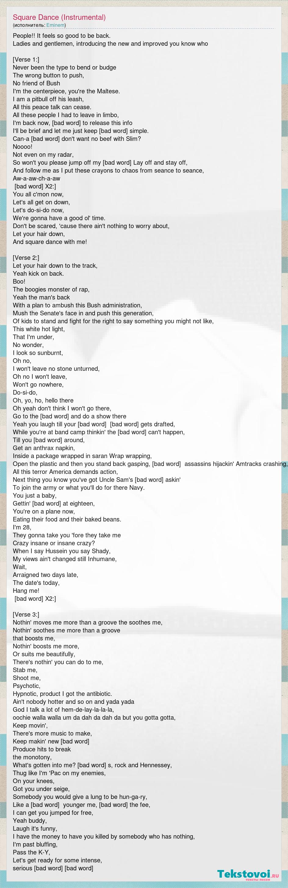 People!! It feels so good to be back. Ladies and gentlemen, introducing the new and improved you know who [Verse 1:] Never been the type to bend or budge The wrong button to push, No friend of Bush I'm the centerpiece, you're the Maltese. I am a pitbull off his leash, All this peace talk can cease. All these people I had to leave in limbo, I'm back now, I've come to release this info I'll be brief and let me just keep [bad word] simple. Can-a [bad word] don't want no beef with Slim? Noooo! Not even on my radar, So won't you please jump off my [bad word] Lay off and stay off, And follow me as I put these crayons to chaos from seance to seance, Aw-a-aw-ch-a-aw [Chorus X2:] You all c'mon now, Let's all get on down, Let's do-si-do now, We're gonna have a good ol' time. Don't be scared, 'cause there ain't nothing to worry about, Let your hair down, And square dance with me! [Verse 2:] Let your hair down to the track, Yeah kick on back. Boo! The boogies monster of rap, Yeah the man's back With a plan to ambush this Bush administration, Mush the Senate's face in and push this generation, Of kids to stand and fight for the right to say something you might not like, This white hot light, That I'm under, No wonder, I look so sunburnt, Oh no, I won't leave no stone unturned, Oh no I won't leave, Won't go nowhere, Do-si-do, Oh, yo, ho, hello there Oh yeah don't think I won't go there, Go to the Beirut and do a show there Yeah you laugh till your [bad word] [bad word] gets drafted, While you're at band camp thinkin' the [bad word] can't happen, Till you [bad word] around, Get an anthrax napkin, Inside a package wrapped in saran Wrap wrapping, Open the plastic and then you stand back gasping, [bad word] assassins hijackin' Amtracks crashing, All this terror America demands action, Next thing you know you've got Uncle Sam's [bad word] askin' To join the army or what you'll do for there Navy. You just a baby, Gettin' recruited at eighteen, You're on a plane now, Eating their food and their baked beans. I'm 28, They gonna take you 'fore they take me Crazy insane or insane crazy? When I say Hussein you say Shady, My views ain't changed still Inhumane, Wait, Arraigned two days late, The date's today, Hang me! [Chorus X2:] [Verse 3:] Nothin' moves me more than a groove the soothes me, Nothin' soothes me more than a groove that boosts me, Nothin' boosts me more, Or suits me beautifully, There's nothin' you can do to me, Stab me, Shoot me, Psychotic, Hypnotic, product I got the antibiotic. Ain't nobody hotter and so on and yada yada God I talk a lot of hem-de-lay-la-la-la, oochie walla walla um da dah da dah da but you gotta gotta, Keep movin', There's more music to make, Keep makin' new [bad word] Produce hits to break the monotony, What's gotten into me? Drug's, rock and Hennessey, Thug like I'm 'Pac on my enemies, On your knees, Got you under seige, Somebody you would give a lung to be hun-ga-ry, Like a [bad word] younger me, [bad word] the fee, I can get you jumped for free, Yeah buddy, Laugh it's funny, I have the money to have you killed by somebody who has nothing, I'm past bluffing, Pass the K-Y, Let's get ready for some intense, serious [bad word] [bad word]