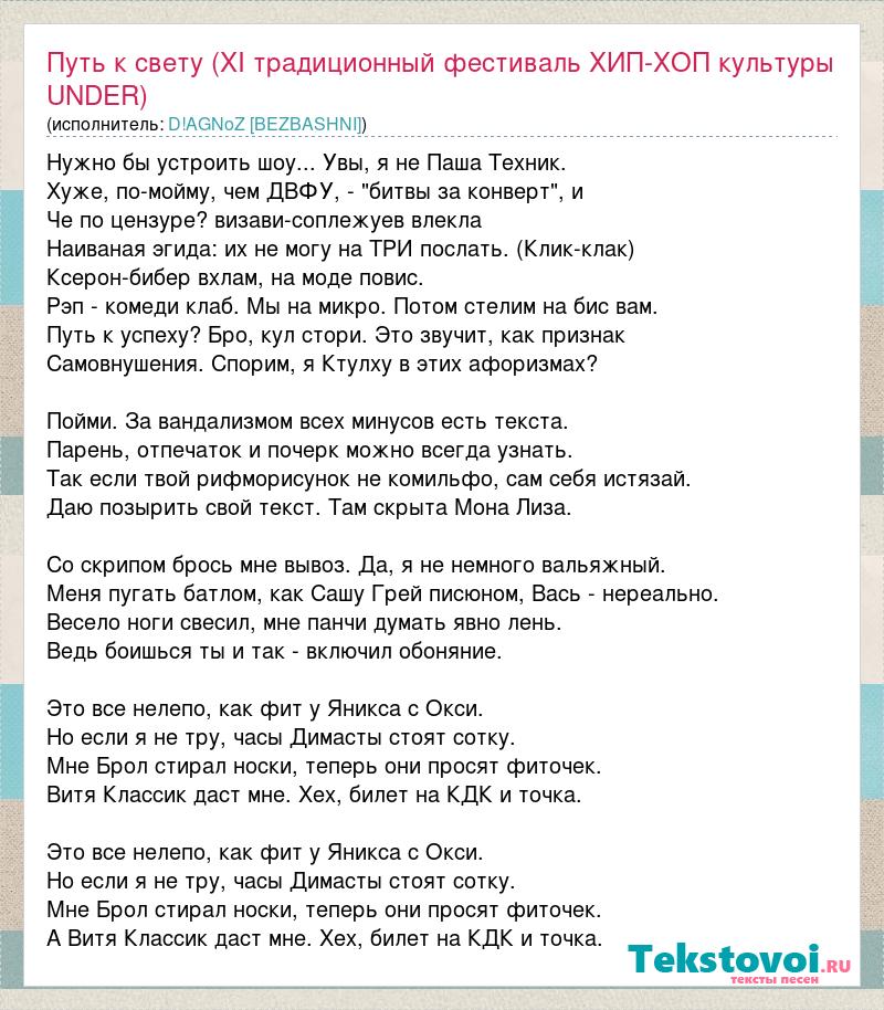 Главная→Исполнители→D!AGNoZ [BEZBASHNI]→Путь к свету (XI традиционный фестиваль ХИП-ХОП культуры UNDER)