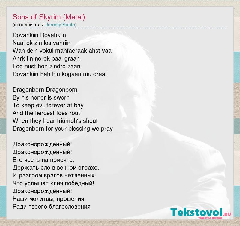 Dovahkiin Dovahkiin Naal ok zin los vahriin Wah dein vokul mahfaeraak ahst vaal Ahrk fin norok paal graan Fod nust hon zindro zaan Dovahkiin Fah hin kogaan mu draal Dragonborn Dragonborn By his honor is sworn To keep evil forever at bay And the fiercest foes rout When they hear triumph's shout Dragonborn for your blessing we pray Драконорожденный! Драконорожденный! Его честь на присяге. Держать зло в вечном страхе. И разгром врагов нетленных. Что услышат клич победный! Драконорожденный! Наши молитвы, прошения. Ради твоего благословения