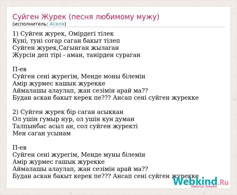 1) Суйген журек, Омірдегі тілек Куні, туні согар саган бакыт тілеп Суйген журек,Сагынган жылаган Журсін деп тірі - аман, танірден сураган П-ев Суйген сені журегім, Менде моны білемін Амір журмес кашык журекке Аймалашы алаулап, жан сезімін арай ма?? Будан аскан бакыт керек пе??? Ансап сені суйген журекке 2) Суйген журек бір саган асыккан Ол ушін гумыр нур, ол ушін кун думан Талпынбас асыл ан, сол суйген журекті Мен саган усынам П-ев Суйген сені журегім, Менде муны білемін Амір журмес гашык журекке Аймалашы алаулап, жан сезімін арай ма?? Будан аскан бакыт керек пе??? Ансап сені суйген журекке