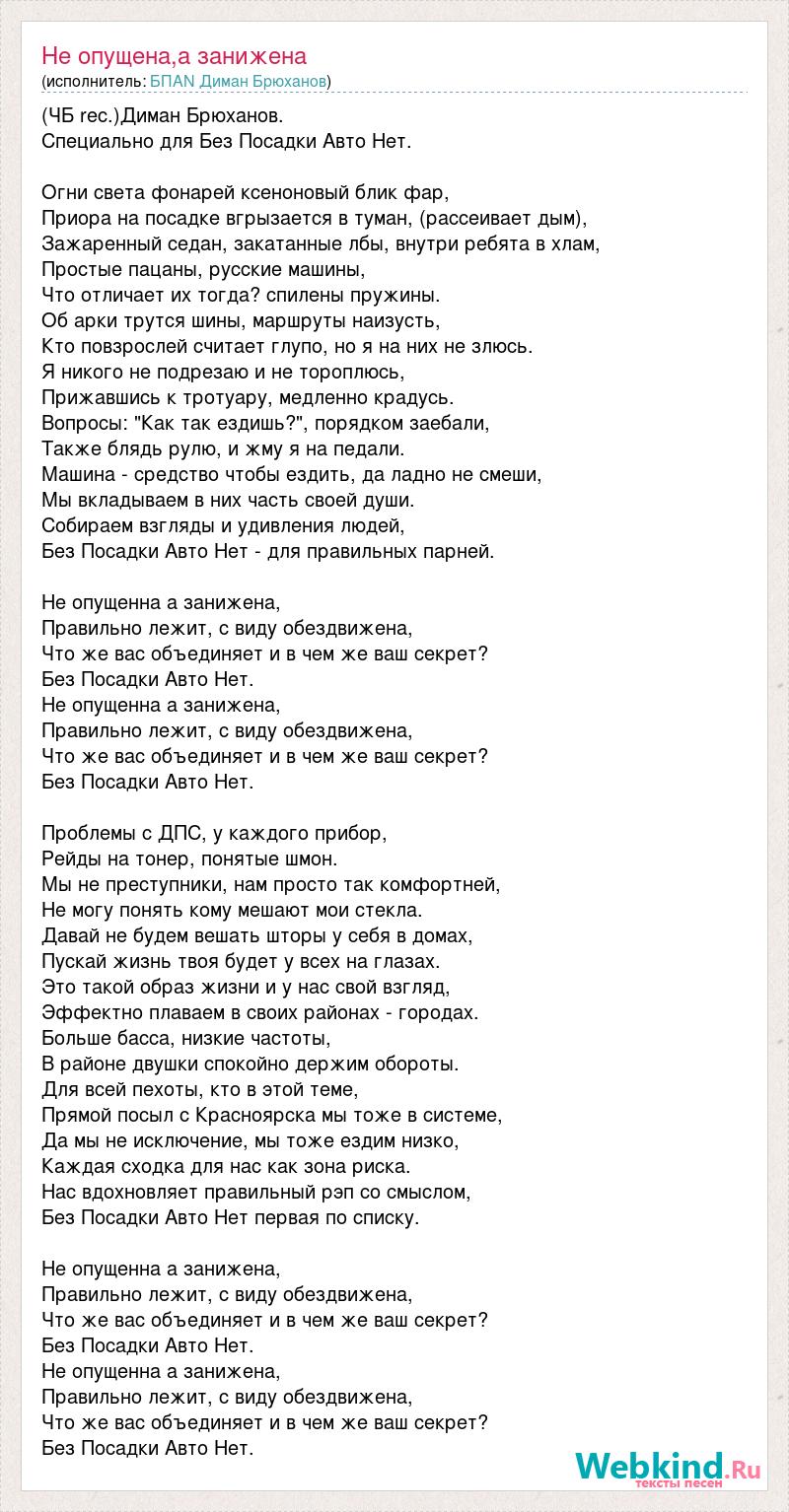 (ЧБ rec.)Диман Брюханов. Специально для Без Посадки Авто Нет. Огни света фонарей ксеноновый блик фар, Приора на посадке вгрызается в туман, (рассеивает дым), Зажаренный седан, закатанные лбы, внутри ребята в хлам, Простые пацаны, русские машины, Что отличает их тогда? спилены пружины. Об арки трутся шины, маршруты наизусть, Кто повзрослей считает глупо, но я на них не злюсь. Я никого не подрезаю и не тороплюсь, Прижавшись к тротуару, медленно крадусь. Вопросы: "Как так ездишь?", порядком заебали, Также блядь рулю, и жму я на педали. Машина - средство чтобы ездить, да ладно не смеши, Мы вкладываем в них часть своей души. Собираем взгляды и удивления людей, Без Посадки Авто Нет - для правильных парней. Не опущенна а занижена, Правильно лежит, с виду обездвижена, Что же вас объединяет и в чем же ваш секрет? Без Посадки Авто Нет. Не опущенна а занижена, Правильно лежит, с виду обездвижена, Что же вас объединяет и в чем же ваш секрет? Без Посадки Авто Нет. Проблемы с ДПС, у каждого прибор, Рейды на тонер, понятые шмон. Мы не преступники, нам просто так комфортней, Не могу понять кому мешают мои стекла. Давай не будем вешать шторы у себя в домах, Пускай жизнь твоя будет у всех на глазах. Это такой образ жизни и у нас свой взгляд, Эффектно плаваем в своих районах - городах. Больше басса, низкие частоты, В районе двушки спокойно держим обороты. Для всей пехоты, кто в этой теме, Прямой посыл с Красноярска мы тоже в системе, Да мы не исключение, мы тоже ездим низко, Каждая сходка для нас как зона риска. Нас вдохновляет правильный рэп со смыслом, Без Посадки Авто Нет первая по списку. Не опущенна а занижена, Правильно лежит, с виду обездвижена, Что же вас объединяет и в чем же ваш секрет? Без Посадки Авто Нет. Не опущенна а занижена, Правильно лежит, с виду обездвижена, Что же вас объединяет и в чем же ваш секрет? Без Посадки Авто Нет.
