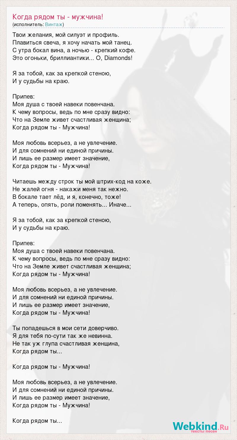 Твои желания, мой силуэт и профиль. Плавиться свеча, я хочу начать мой танец. С утра бокал вина, а ночью - крепкий кофе. Это огоньки, бриллиантики... О, Diamonds! Я за тобой, как за крепкой стеною, И у судьбы на краю. Припев: Моя душа с твоей навеки повенчана. К чему вопросы, ведь по мне сразу видно: Что на Земле живет счастливая женщина; Когда рядом ты - Мужчина! Моя любовь всерьез, а не увлечение. И для сомнений ни единой причины. И лишь ее размер имеет значение, Когда рядом ты - Мужчина! Читаешь между строк ты мой штрих-код на коже. Не жалей огня - накажи меня так нежно. В бокале тает лёд, и я, конечно, тоже! А теперь, опять, роли поменять... Иначе... Я за тобой, как за крепкой стеною, И у судьбы на краю. Припев: Моя душа с твоей навеки повенчана. К чему вопросы, ведь по мне сразу видно: Что на Земле живет счастливая женщина; Когда рядом ты - Мужчина! Моя любовь всерьез, а не увлечение. И для сомнений ни единой причины. И лишь ее размер имеет значение, Когда рядом ты - Мужчина! Ты попадешься в мои сети доверчиво. Я для тебя по-сути так же невинна. Не так уж глупа счастливая женщина, Когда рядом ты... Когда рядом ты - Мужчина! Моя любовь всерьез, а не увлечение. И для сомнений ни единой причины. И лишь ее размер имеет значение, Когда рядом ты - Мужчина! Когда рядом ты...