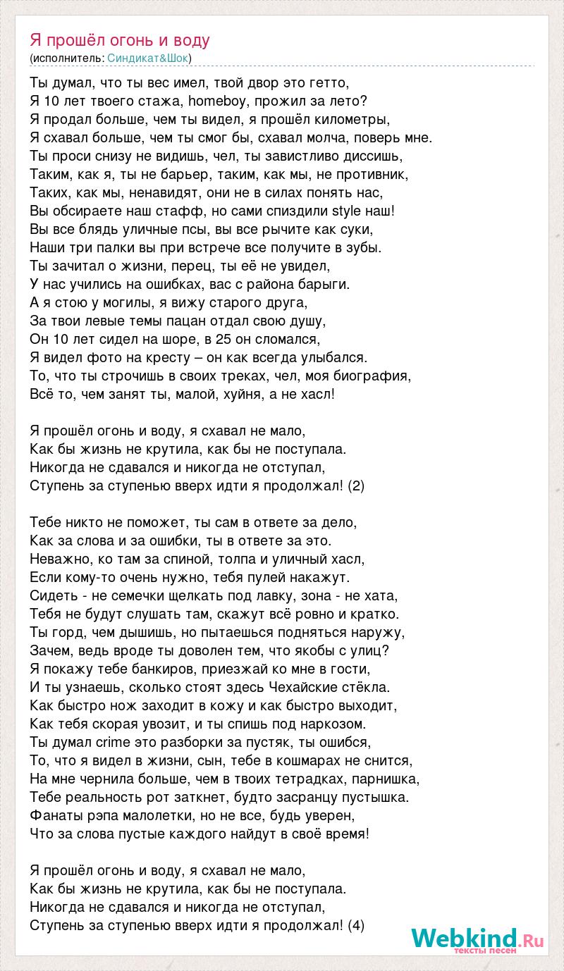 Ты думал, что ты вес имел, твой двор это гетто, Я 10 лет твоего стажа, homeboy, прожил за лето? Я продал больше, чем ты видел, я прошёл километры, Я схавал больше, чем ты смог бы, схавал молча, поверь мне. Ты проси снизу не видишь, чел, ты завистливо диссишь, Таким, как я, ты не барьер, таким, как мы, не противник, Таких, как мы, ненавидят, они не в силах понять нас, Вы обсираете наш стафф, но сами спиздили style наш! Вы все блядь уличные псы, вы все рычите как суки, Наши три палки вы при встрече все получите в зубы. Ты зачитал о жизни, перец, ты её не увидел, У нас учились на ошибках, вас с района барыги. А я стою у могилы, я вижу старого друга, За твои левые темы пацан отдал свою душу, Он 10 лет сидел на шоре, в 25 он сломался, Я видел фото на кресту – он как всегда улыбался. То, что ты строчишь в своих треках, чел, моя биография, Всё то, чем занят ты, малой, хуйня, а не хасл! Я прошёл огонь и воду, я схавал не мало, Как бы жизнь не крутила, как бы не поступала. Никогда не сдавался и никогда не отступал, Ступень за ступенью вверх идти я продолжал! (2) Тебе никто не поможет, ты сам в ответе за дело, Как за слова и за ошибки, ты в ответе за это. Неважно, ко там за спиной, толпа и уличный хасл, Если кому-то очень нужно, тебя пулей накажут. Сидеть - не семечки щелкать под лавку, зона - не хата, Тебя не будут слушать там, скажут всё ровно и кратко. Ты горд, чем дышишь, но пытаешься подняться наружу, Зачем, ведь вроде ты доволен тем, что якобы с улиц? Я покажу тебе банкиров, приезжай ко мне в гости, И ты узнаешь, сколько стоят здесь Чехайские стёкла. Как быстро нож заходит в кожу и как быстро выходит, Как тебя скорая увозит, и ты спишь под наркозом. Ты думал crime это разборки за пустяк, ты ошибся, То, что я видел в жизни, сын, тебе в кошмарах не снится, На мне чернила больше, чем в твоих тетрадках, парнишка, Тебе реальность рот заткнет, будто засранцу пустышка. Фанаты рэпа малолетки, но не все, будь уверен, Что за слова пустые каждого найдут в своё время! Я прошёл огонь и воду, я схавал не мало, Как бы жизнь не крутила, как бы не поступала. Никогда не сдавался и никогда не отступал, Ступень за ступенью вверх идти я продолжал! (4)
