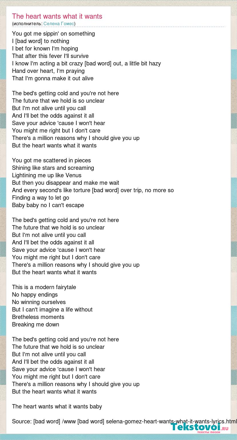 You got me sippin' on something I can't compare to nothing I bet for known I'm hoping That after this fever I'll survive I know I'm acting a bit crazy Strung out, a little bit hazy Hand over heart, I'm praying That I'm gonna make it out alive The bed's getting cold and you're not here The future that we hold is so unclear But I'm not alive until you call And I'll bet the odds against it all Save your advice 'cause I won't hear You might me right but I don't care There's a million reasons why I should give you up But the heart wants what it wants You got me scattered in pieces Shining like stars and screaming Lightining me up like Venus But then you disappear and make me wait And every second's like torture Hell over trip, no more so Finding a way to let go Baby baby no I can't escape The bed's getting cold and you're not here The future that we hold is so unclear But I'm not alive until you call And I'll bet the odds against it all Save your advice 'cause I won't hear You might me right but I don't care There's a million reasons why I should give you up But the heart wants what it wants This is a modern fairytale No happy endings No winning ourselves But I can't imagine a life without Bretheless moments Breaking me down The bed's getting cold and you're not here The future that we hold is so unclear But I'm not alive until you call And I'll bet the odds against it all Save your advice 'cause I won't hear You might me right but I don't care There's a million reasons why I should give you up But the heart wants what it wants The heart wants what it wants baby Source: [bad word] /www [bad word] selena-gomez-heart-wants-what-it-wants-lyrics.html