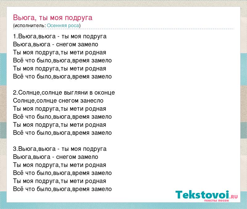 1.Вьюга,вьюга - ты моя подруга Вьюга,вьюга - снегом замело Ты моя подруга,ты мети родная Всё что было,вьюга,время замело Ты моя подруга,ты мети родная Всё что было,вьюга,время замело 2.Солнце,солнце выгляни в оконце Солнце,солнце снегом занесло Ты моя подруга,ты мети родная Всё что было,вьюга,время замело Ты моя подруга,ты мети родная Всё что было,вьюга,время замело 3.Вьюга,вьюга - ты моя подруга Вьюга,вьюга - снегом замело Ты моя подруга,ты мети родная Всё что было,вьюга,время замело Ты моя подруга,ты мети родная Всё что было,вьюга,время замело