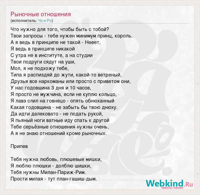 Что нужно для того, чтобы быть с тобой? Твои запросы - тебе нужен минимум принц, король. А я ведь в принципе не такой - Нееет, Я ведь в принципе никакой С утра не в институте, а на студии Твои подруги сядут на уши, Мол, я не подхожу тебе, Типа я распиздяй до жути, какой-то ветреный, Друзья все наркоманы или просто с приветом они, У нас годовщина 3 дня и 10 часов, Я просто не мужчина, если не куплю кольцо, Я лавэ слил на говнецо - опять обнюханный Какая годовщина - не забыть бы твою днюху. Да идти далековато - не подать рукой, Я пьяный ноги ватные иду спать к другой Тебе серьёзные отношения нужны очень, А я не знаю отношений кроме рыночных. Припев Тебя нужна любовь, плюшевые мишки, Я люблю плюшки - долблю шишки, Тебя нужны Милан-Париж-Рим. Прости милая - тут план-гашиш-дым.