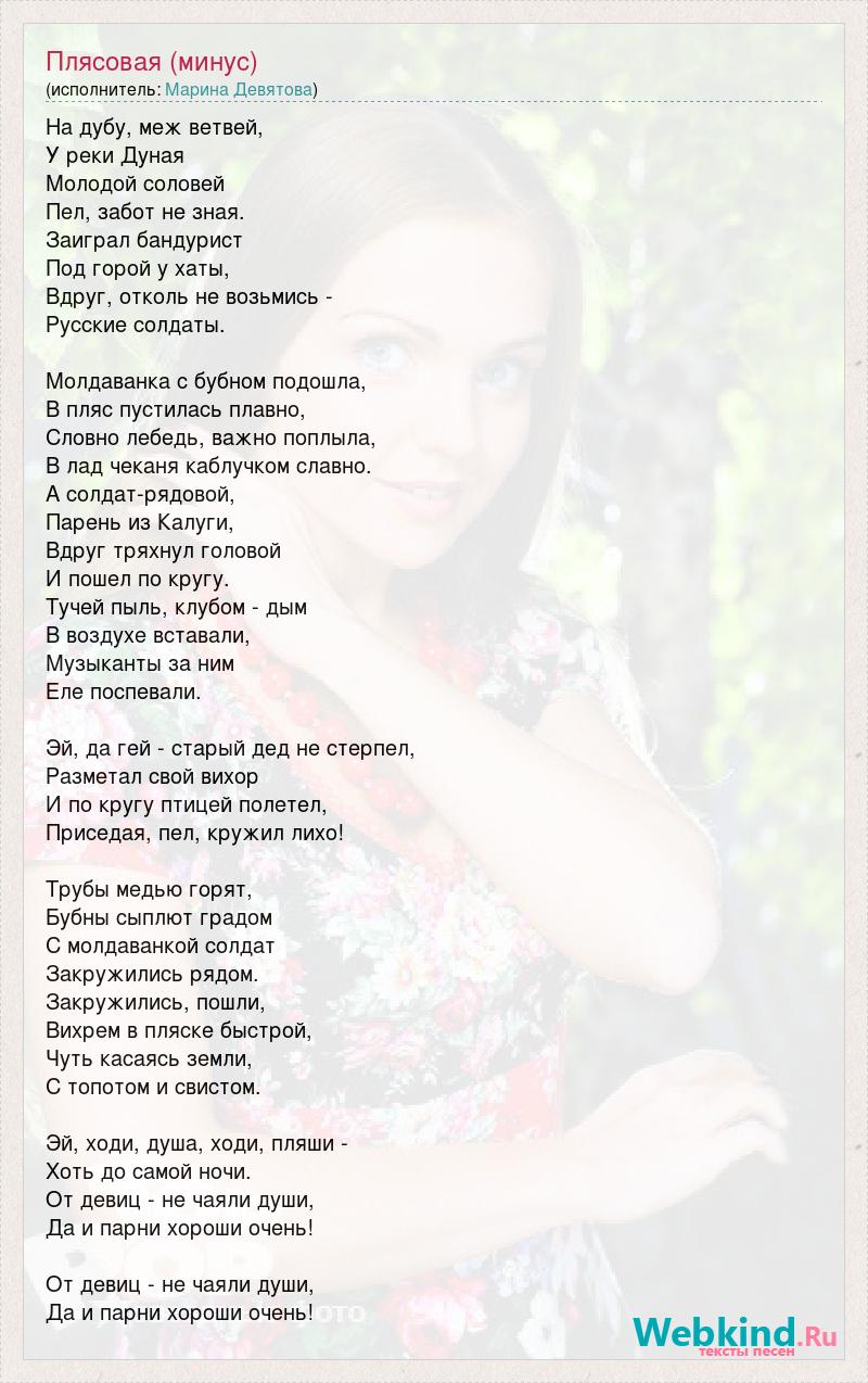 На дубу, меж ветвей, У реки Дуная Молодой соловей Пел, забот не зная. Заиграл бандурист Под горой у хаты, Вдруг, отколь не возьмись - Русские солдаты. Молдаванка с бубном подошла, В пляс пустилась плавно, Словно лебедь, важно поплыла, В лад чеканя каблучком славно. А солдат-рядовой, Парень из Калуги, Вдруг тряхнул головой И пошел по кругу. Тучей пыль, клубом - дым В воздухе вставали, Музыканты за ним Еле поспевали. Эй, да гей - старый дед не стерпел, Разметал свой вихор И по кругу птицей полетел, Приседая, пел, кружил лихо! Трубы медью горят, Бубны сыплют градом С молдаванкой солдат Закружились рядом. Закружились, пошли, Вихрем в пляске быстрой, Чуть касаясь земли, С топотом и свистом. Эй, ходи, душа, ходи, пляши - Хоть до самой ночи. От девиц - не чаяли души, Да и парни хороши очень! От девиц - не чаяли души, Да и парни хороши очень!