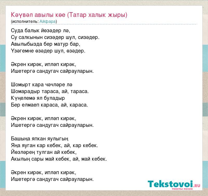 Суда балык йөзәдер лә, Су салкынын сизәдер шул, сизәдер. Авылыбызда бер матур бар, Үзәгемне өзәдер шул, өзәдер. Әкрен кирәк, ипләп кирәк, Ишетергә сандугач сайрауларын. Шомырт кара чәчләре лә Шомарадыр тараса, ай, тараса. Күңелемә ял буладыр Бер елмаеп караса, ай, караса. Әкрен кирәк, ипләп кирәк, Ишетергә сандугач сайрауларын. Башыңа япкан яулыгың Яңа яуган кар кебек, ай, кар кебек. Йөзләрең тулган ай кебек, Акылың сары май кебек, ай, май кебек. Әкрен кирәк, ипләп кирәк, Ишетергә сандугач сайрауларын.