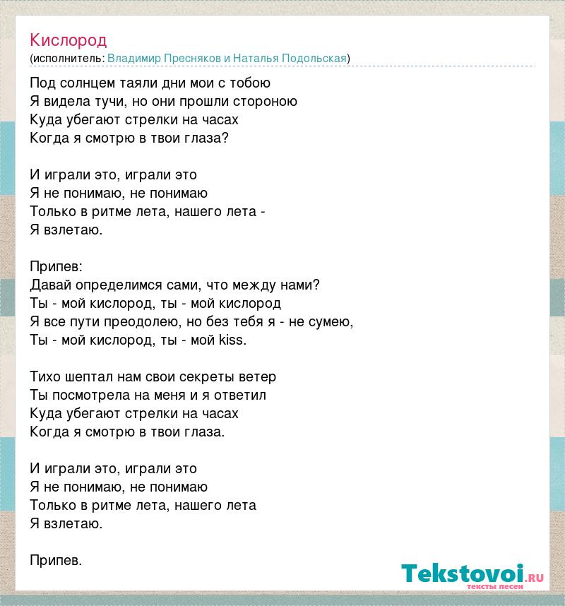 Под солнцем таяли дни мои с тобою Я видела тучи, но они прошли стороною Куда убегают стрелки на часах Когда я смотрю в твои глаза? И играли это, играли это Я не понимаю, не понимаю Только в ритме лета, нашего лета - Я взлетаю. Припев: Давай определимся сами, что между нами? Ты - мой кислород, ты - мой кислород Я все пути преодолею, но без тебя я - не сумею, Ты - мой кислород, ты - мой kiss. Тихо шептал нам свои секреты ветер Ты посмотрела на меня и я ответил Куда убегают стрелки на часах Когда я смотрю в твои глаза. И играли это, играли это Я не понимаю, не понимаю Только в ритме лета, нашего лета Я взлетаю. Припев.