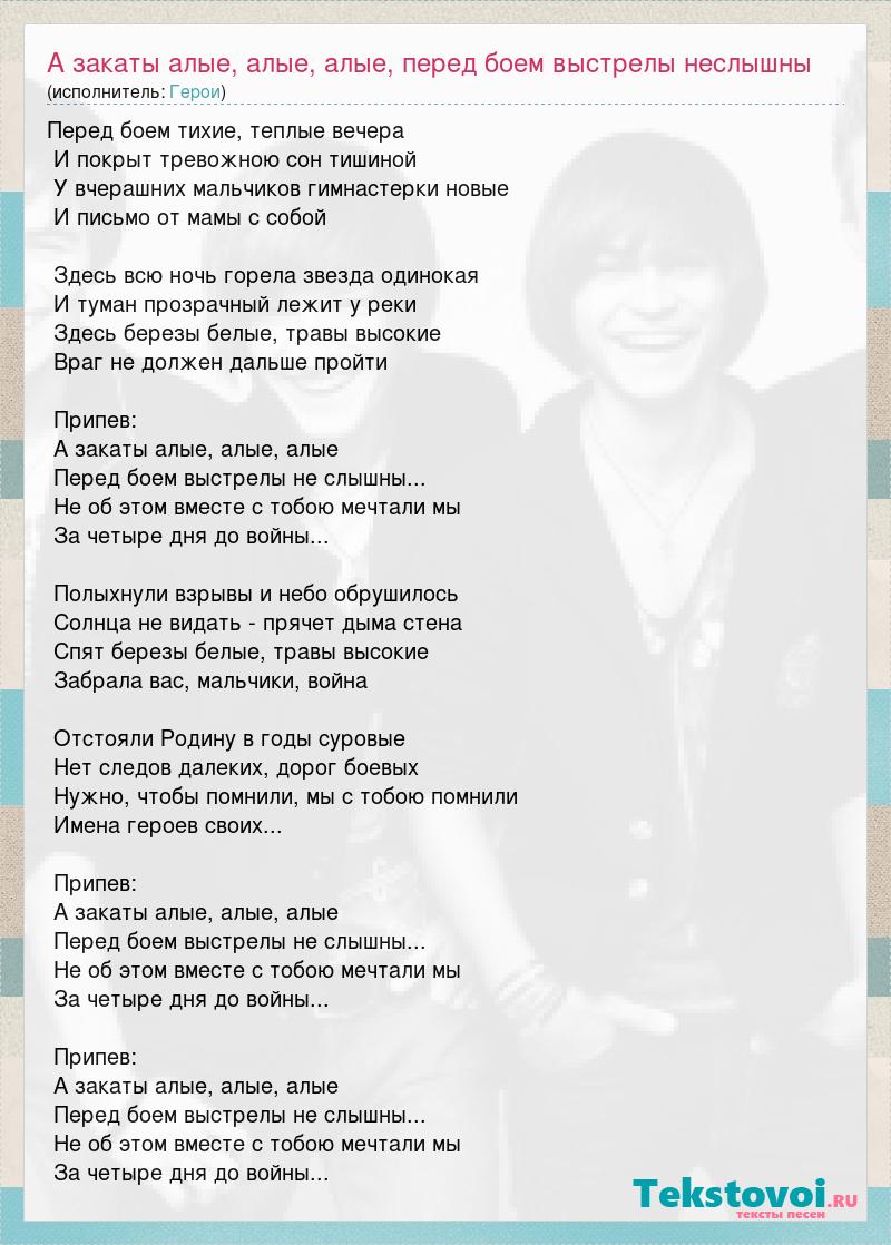 Перед боем тихие, теплые вечера И покрыт тревожною сон тишиной У вчерашних мальчиков гимнастерки новые И письмо от мамы с собой Здесь всю ночь горела звезда одинокая И туман прозрачный лежит у реки Здесь березы белые, травы высокие Враг не должен дальше пройти Припев: А закаты алые, алые, алые Перед боем выстрелы не слышны... Не об этом вместе с тобою мечтали мы За четыре дня до войны... Полыхнули взрывы и небо обрушилось Солнца не видать - прячет дыма стена Спят березы белые, травы высокие Забрала вас, мальчики, война Отстояли Родину в годы суровые Нет следов далеких, дорог боевых Нужно, чтобы помнили, мы с тобою помнили Имена героев своих... Припев: А закаты алые, алые, алые Перед боем выстрелы не слышны... Не об этом вместе с тобою мечтали мы За четыре дня до войны... Припев: А закаты алые, алые, алые Перед боем выстрелы не слышны... Не об этом вместе с тобою мечтали мы За четыре дня до войны...