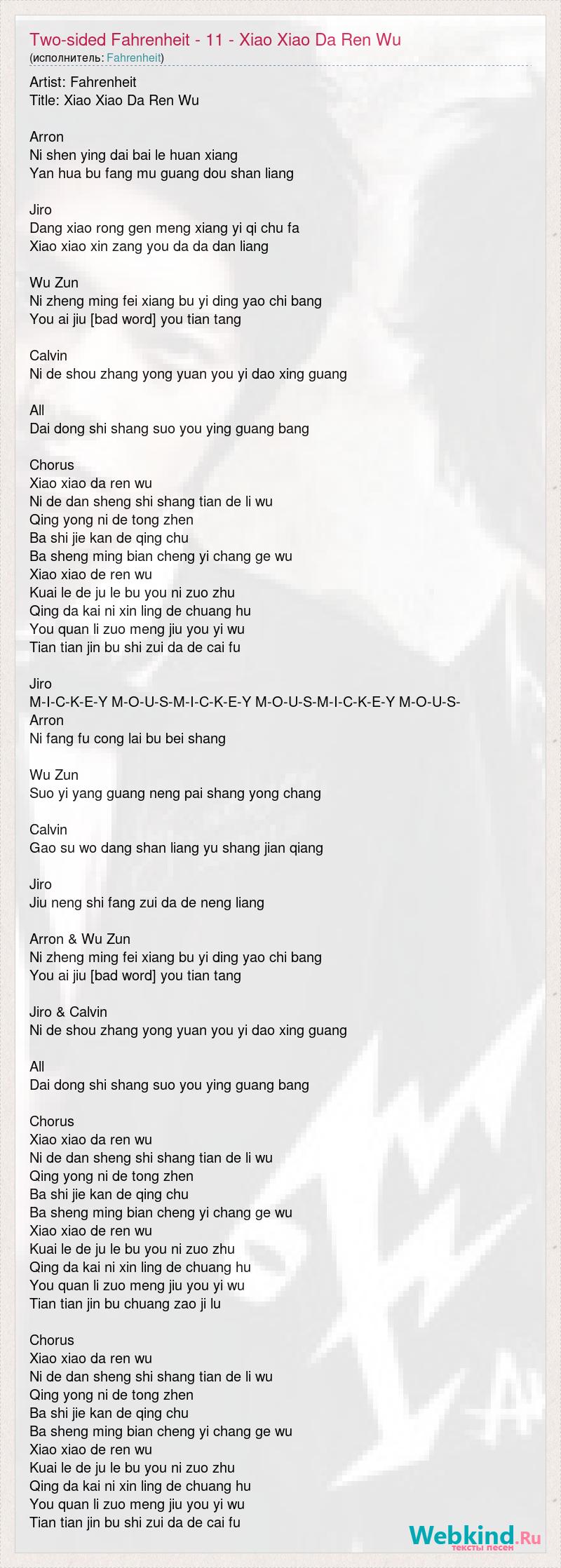 Artist: Fahrenheit Title: Xiao Xiao Da Ren Wu Arron Ni shen ying dai bai le huan xiang Yan hua bu fang mu guang dou shan liang Jiro Dang xiao rong gen meng xiang yi qi chu fa Xiao xiao xin zang you da da dan liang Wu Zun Ni zheng ming fei xiang bu yi ding yao chi bang You ai jiu [bad word] you tian tang Calvin Ni de shou zhang yong yuan you yi dao xing guang All Dai dong shi shang suo you ying guang bang Chorus Xiao xiao da ren wu Ni de dan sheng shi shang tian de li wu Qing yong ni de tong zhen Ba shi jie kan de qing chu Ba sheng ming bian cheng yi chang ge wu Xiao xiao de ren wu Kuai le de ju le bu you ni zuo zhu Qing da kai ni xin ling de chuang hu You quan li zuo meng jiu you yi wu Tian tian jin bu shi zui da de cai fu Jiro M-I-C-K-E-Y M-O-U-S-M-I-C-K-E-Y M-O-U-S-M-I-C-K-E-Y M-O-U-S- Arron Ni fang fu cong lai bu bei shang Wu Zun Suo yi yang guang neng pai shang yong chang Calvin Gao su wo dang shan liang yu shang jian qiang Jiro Jiu neng shi fang zui da de neng liang Arron & Wu Zun Ni zheng ming fei xiang bu yi ding yao chi bang You ai jiu [bad word] you tian tang Jiro & Calvin Ni de shou zhang yong yuan you yi dao xing guang All Dai dong shi shang suo you ying guang bang Chorus Xiao xiao da ren wu Ni de dan sheng shi shang tian de li wu Qing yong ni de tong zhen Ba shi jie kan de qing chu Ba sheng ming bian cheng yi chang ge wu Xiao xiao de ren wu Kuai le de ju le bu you ni zuo zhu Qing da kai ni xin ling de chuang hu You quan li zuo meng jiu you yi wu Tian tian jin bu chuang zao ji lu Chorus Xiao xiao da ren wu Ni de dan sheng shi shang tian de li wu Qing yong ni de tong zhen Ba shi jie kan de qing chu Ba sheng ming bian cheng yi chang ge wu Xiao xiao de ren wu Kuai le de ju le bu you ni zuo zhu Qing da kai ni xin ling de chuang hu You quan li zuo meng jiu you yi wu Tian tian jin bu shi zui da de cai fu