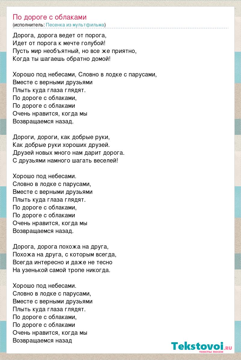 Дорога, дорога ведет от порога, Идет от порога к мечте голубой! Пусть мир необъятный, но все же приятно, Когда ты шагаешь обратно домой! Хорошо под небесами, Словно в лодке с парусами, Вместе с верными друзьями Плыть куда глаза глядят. По дороге с облаками, По дороге с облаками Очень нравится, когда мы Возвращаемся назад. Дороги, дороги, как добрые руки, Как добрые руки хороших друзей. Друзей новых много нам дарит дорога. С друзьями намного шагать веселей! Хорошо под небесами. Словно в лодке с парусами, Вместе с верными друзьями Плыть куда глаза глядят. По дороге с облаками, По дороге с облаками Очень нравится, когда мы Возвращаемся назад. Дорога, дорога похожа на друга, Похожа на друга, с которым всегда, Всегда интересно и даже не тесно На узенькой самой тропе никогда. Хорошо под небесами. Словно в лодке с парусами, Вместе с верными друзьями Плыть куда глаза глядят. По дороге с облаками, По дороге с облаками Очень нравится, когда мы Возвращаемся назад