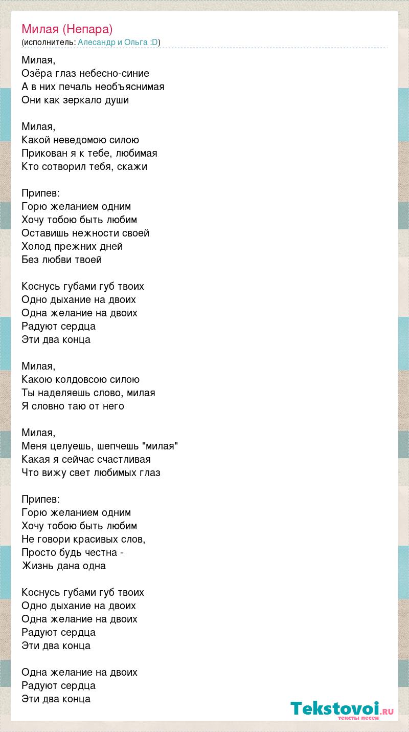 Милая, Озёра глаз небесно-синие А в них печаль необъяснимая Они как зеркало души Милая, Какой неведомою силою Прикован я к тебе, любимая Кто сотворил тебя, скажи Припев: Горю желанием одним Хочу тобою быть любим Оставишь нежности своей Холод прежних дней Без любви твоей Коснусь губами губ твоих Одно дыхание на двоих Одна желание на двоих Радуют сердца Эти два конца Милая, Какою колдовсою силою Ты наделяешь слово, милая Я словно таю от него Милая, Меня целуешь, шепчешь "милая" Какая я сейчас счастливая Что вижу свет любимых глаз Припев: Горю желанием одним Хочу тобою быть любим Не говори красивых слов, Просто будь честна - Жизнь дана одна Коснусь губами губ твоих Одно дыхание на двоих Одна желание на двоих Радуют сердца Эти два конца Одна желание на двоих Радуют сердца Эти два конца