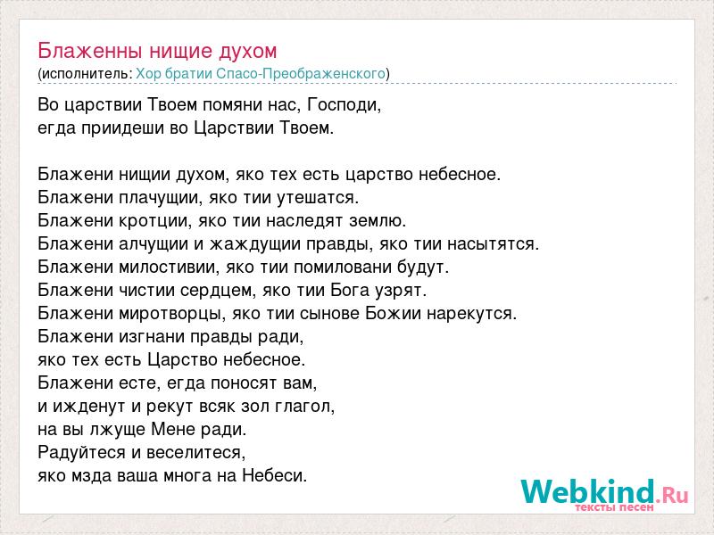 Во царствии Твоем помяни нас, Господи, егда приидеши во Царствии Твоем. Блажени нищии духом, яко тех есть царство небесное. Блажени плачущии, яко тии утешатся. Блажени кротции, яко тии наследят землю. Блажени алчущии и жаждущии правды, яко тии насытятся. Блажени милостивии, яко тии помиловани будут. Блажени чистии сердцем, яко тии Бога узрят. Блажени миротворцы, яко тии сынове Божии нарекутся. Блажени изгнани правды ради, яко тех есть Царство небесное. Блажени есте, егда поносят вам, и ижденут и рекут всяк зол глагол, на вы лжуще Мене ради. Радуйтеся и веселитеся, яко мзда ваша многа на Небеси.