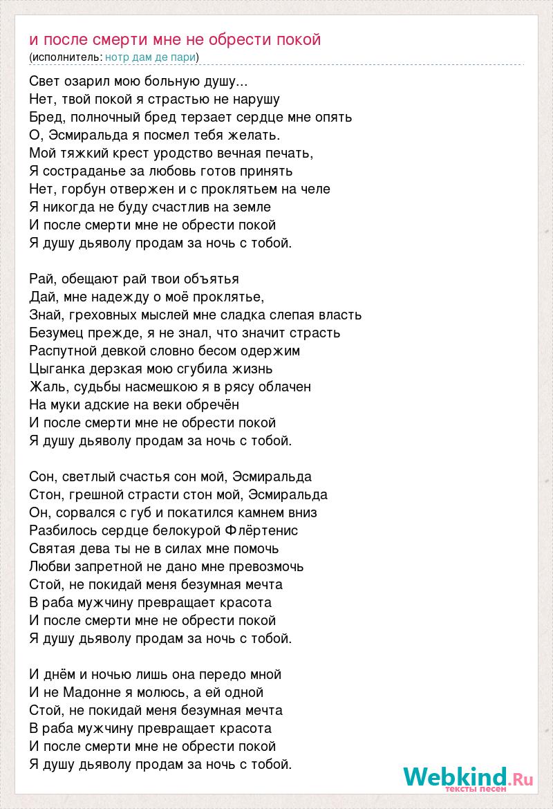 Свет озарил мою больную душу... Нет, твой покой я страстью не нарушу Бред, полночный бред терзает сердце мне опять О, Эсмиральда я посмел тебя желать. Мой тяжкий крест уродство вечная печать, Я состраданье за любовь готов принять Нет, горбун отвержен и с проклятьем на челе Я никогда не буду счастлив на земле И после смерти мне не обрести покой Я душу дьяволу продам за ночь с тобой. Рай, обещают рай твои объятья Дай, мне надежду о моё проклятье, Знай, греховных мыслей мне сладка слепая власть Безумец прежде, я не знал, что значит страсть Распутной девкой словно бесом одержим Цыганка дерзкая мою сгубила жизнь Жаль, судьбы насмешкою я в рясу облачен На муки адские на веки обречён И после смерти мне не обрести покой Я душу дьяволу продам за ночь с тобой. Сон, светлый счастья сон мой, Эсмиральда Стон, грешной страсти стон мой, Эсмиральда Он, сорвался с губ и покатился камнем вниз Разбилось сердце белокурой Флёртенис Святая дева ты не в силах мне помочь Любви запретной не дано мне превозмочь Стой, не покидай меня безумная мечта В раба мужчину превращает красота И после смерти мне не обрести покой Я душу дьяволу продам за ночь с тобой. И днём и ночью лишь она передо мной И не Мадонне я молюсь, а ей одной Стой, не покидай меня безумная мечта В раба мужчину превращает красота И после смерти мне не обрести покой Я душу дьяволу продам за ночь с тобой.