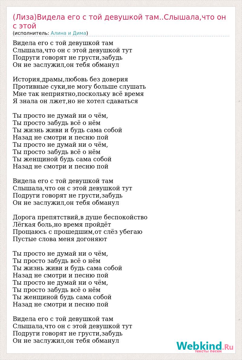 Видела его с той девушкой там Слышала,что он с этой девушкой тут Подруги говорят не грусти,забудь Он не заслужил,он тебя обманул История,драмы,любовь без доверия Противные суки,не могу больше слушать Мне так неприятно,поскольку всё время Я знала он лжет,но не хотел сдаваться Ты просто не думай ни о чём, Ты просто забудь всё о нём Ты жизнь живи и будь сама собой Назад не смотри и песню пой Ты просто не думай ни о чём, Ты просто забудь всё о нём Ты женщиной будь сама собой Назад не смотри и песню пой Видела его с той девушкой там Слышала,что он с этой девушкой тут Подруги говорят не грусти,забудь Он не заслужил,он тебя обманул Дорога препятствий,в душе беспокойство Лёгкая боль,но время пройдёт Прощаюсь с прошедшим,от слёз убегаю Пустые слова меня догоняют Ты просто не думай ни о чём, Ты просто забудь всё о нём Ты жизнь живи и будь сама собой Назад не смотри и песню пой Ты просто не думай ни о чём, Ты просто забудь всё о нём Ты женщиной будь сама собой Назад не смотри и песню пой Видела его с той девушкой там Слышала,что он с этой девушкой тут Подруги говорят не грусти,забудь Он не заслужил,он тебя обманул