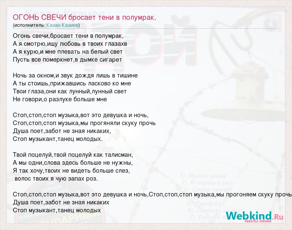 Огонь свечи,бросает тени в полумрак, А я смотрю,ищу любовь в твоих глазахв А я курю,и мне плевать на белый свет Пусть все померкнет,в дымке сигарет Ночь за окном,и звук дождя лишь в тишине А ты стоишь,прижавшись ласково ко мне Твои глаза,они как лунный,лунный свет Не говори,о разлуке больше мне Стоп,стоп,стоп музыка,вот это девушка и ночь, Стоп,стоп,стоп музыка,мы прогяняли скуку прочь Душа поет,забот не зная никаких, Стоп музыкант,танец молодых. Твой поцелуй,твой поцелуй как талисман, А мы одни,слова здесь больше не нужны, Я так хочу,твоих не видеть больше слез, волос твоих я чую запах роз. Стоп,стоп,стоп музыка,вот это девушка и ночь,Стоп,стоп,стоп музыка,мы прогоняем скуку прочь Душа поет,забот не зная никаких Стоп музыкант,танец молодых