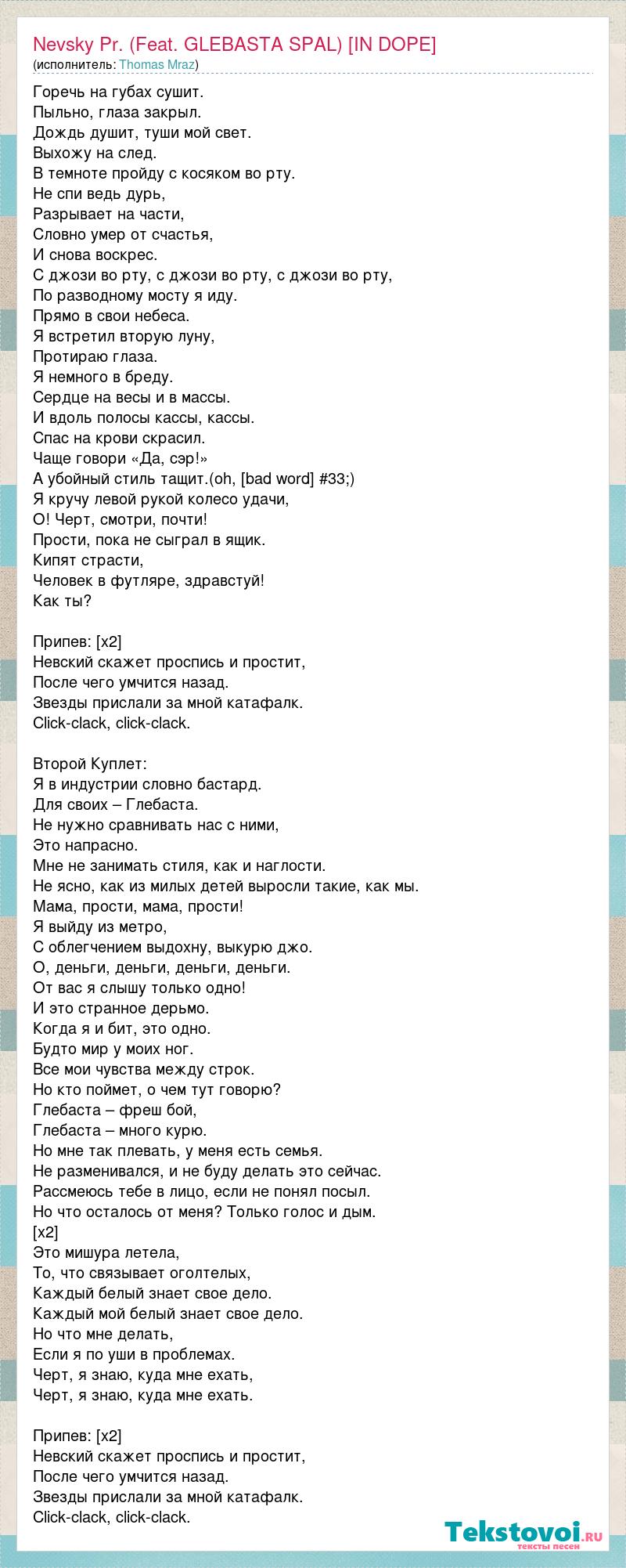 Горечь на губах сушит. Пыльно, глаза закрыл. Дождь душит, туши мой свет. Выхожу на след. В темноте пройду с косяком во рту. Не спи ведь дурь, Разрывает на части, Словно умер от счастья, И снова воскрес. С джози во рту, с джози во рту, с джози во рту, По разводному мосту я иду. Прямо в свои небеса. Я встретил вторую луну, Протираю глаза. Я немного в бреду. Сердце на весы и в массы. И вдоль полосы кассы, кассы. Спас на крови скрасил. Чаще говори «Да, сэр!» А убойный стиль тащит.(oh, [bad word] #33;) Я кручу левой рукой колесо удачи, О! Черт, смотри, почти! Прости, пока не сыграл в ящик. Кипят страсти, Человек в футляре, здравстуй! Как ты? Припев: [х2] Невский скажет проспись и простит, После чего умчится назад. Звезды прислали за мной катафалк. Click-clack, click-clack. Второй Куплет: Я в индустрии словно бастард. Для своих – Глебаста. Не нужно сравнивать нас с ними, Это напрасно. Мне не занимать стиля, как и наглости. Не ясно, как из милых детей выросли такие, как мы. Мама, прости, мама, прости! Я выйду из метро, С облегчением выдохну, выкурю джо. О, деньги, деньги, деньги, деньги. От вас я слышу только одно! И это странное дерьмо. Когда я и бит, это одно. Будто мир у моих ног. Все мои чувства между строк. Но кто поймет, о чем тут говорю? Глебаста – фреш бой, Глебаста – много курю. Но мне так плевать, у меня есть семья. Не разменивался, и не буду делать это сейчас. Рассмеюсь тебе в лицо, если не понял посыл. Но что осталось от меня? Только голос и дым. [х2] Это мишура летела, То, что связывает оголтелых, Каждый белый знает свое дело. Каждый мой белый знает свое дело. Но что мне делать, Если я по уши в проблемах. Черт, я знаю, куда мне ехать, Черт, я знаю, куда мне ехать. Припев: [х2] Невский скажет проспись и простит, После чего умчится назад. Звезды прислали за мной катафалк. Click-clack, click-clack.