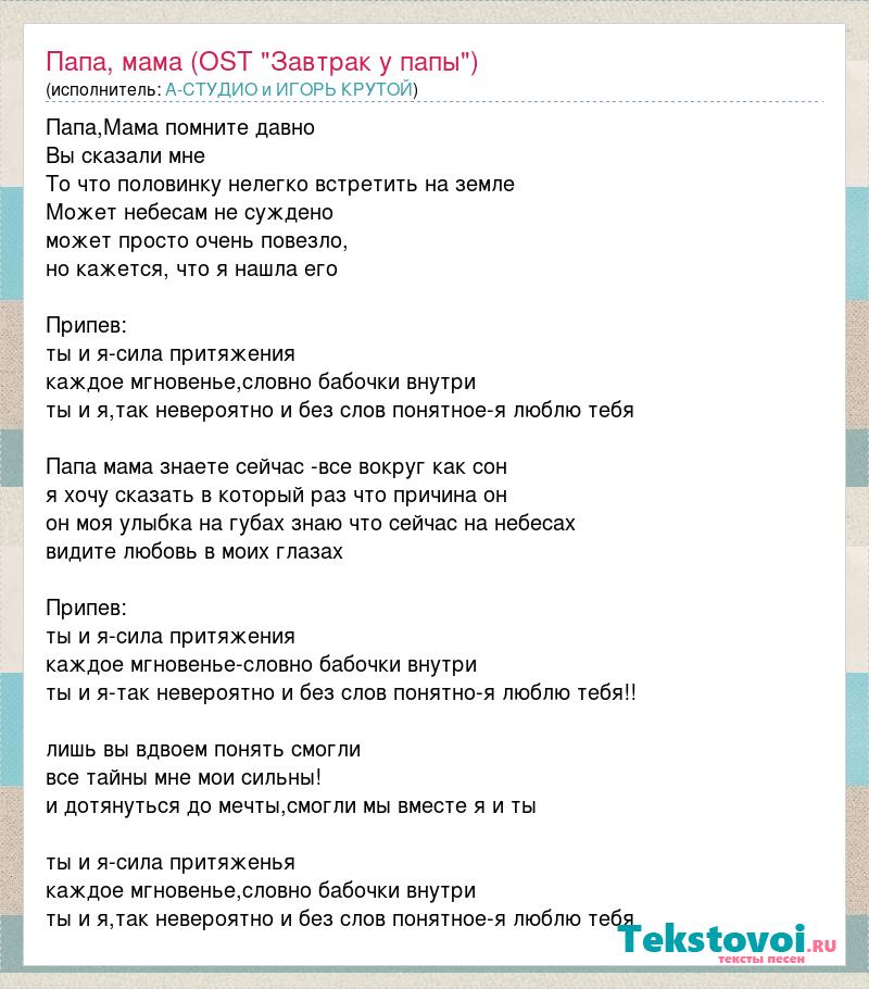 Папа,Мама помните давно Вы сказали мне То что половинку нелегко встретить на земле Может небесам не суждено может просто очень повезло, но кажется, что я нашла его Припев: ты и я-сила притяжения каждое мгновенье,словно бабочки внутри ты и я,так невероятно и без слов понятное-я люблю тебя Папа мама знаете сейчас -все вокруг как сон я хочу сказать в который раз что причина он он моя улыбка на губах знаю что сейчас на небесах видите любовь в моих глазах Припев: ты и я-сила притяжения каждое мгновенье-словно бабочки внутри ты и я-так невероятно и без слов понятно-я люблю тебя!! лишь вы вдвоем понять смогли все тайны мне мои сильны! и дотянуться до мечты,смогли мы вместе я и ты ты и я-сила притяженья каждое мгновенье,словно бабочки внутри ты и я,так невероятно и без слов понятное-я люблю тебя