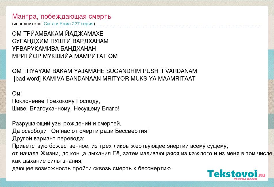 ОМ ТРЙАМБАКАМ ЙАДЖАМАХЕ СУГАНДХИМ ПУШТИ ВАРДХАНАМ УРВАРУКАМИВА БАНДХАНАН МРИТЙОР МУКШИЙА МАМРИТАТ ОМ OM TRYAYAM BAKAM YAJAMAHE SUGANDHIM PUSHTI VARDANAM [bad word] KAMIVA BANDANAAN MRITYOR MUKSIYA MAAMRITAAT Ом! Поклонение Трехокому Господу, Шиве, Благоуханному, Несущему Благо! Разрушающий узы рождений и смертей, Да освободит Он нас от смерти ради Бессмертия! Другой вариант перевода: Приветствую божественное, из трех ликов жертвующее энергии всему сущему, от начала Жизни, до конца дыхания Её, затем изливающаяся из каждого и из меня в том числе, как дыхание силы знания, дающее возможность пройти сквозь смерть к бессмертию.