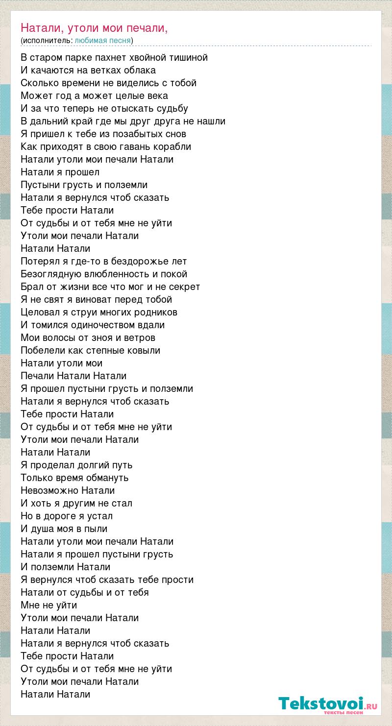 В старом парке пахнет хвойной тишиной И качаются на ветках облака Сколько времени не виделись с тобой Может год а может целые века И за что теперь не отыскать судьбу В дальний край где мы друг друга не нашли Я пришел к тебе из позабытых снов Как приходят в свою гавань корабли Натали утоли мои печали Натали Натали я прошел Пустыни грусть и полземли Натали я вернулся чтоб сказать Тебе прости Натали От судьбы и от тебя мне не уйти Утоли мои печали Натали Натали Натали Потерял я где-то в бездорожье лет Безоглядную влюбленность и покой Брал от жизни все что мог и не секрет Я не свят я виноват перед тобой Целовал я струи многих родников И томился одиночеством вдали Мои волосы от зноя и ветров Побелели как степные ковыли Натали утоли мои Печали Натали Натали Я прошел пустыни грусть и полземли Натали я вернулся чтоб сказать Тебе прости Натали От судьбы и от тебя мне не уйти Утоли мои печали Натали Натали Натали Я проделал долгий путь Только время обмануть Невозможно Натали И хоть я другим не стал Но в дороге я устал И душа моя в пыли Натали утоли мои печали Натали Натали я прошел пустыни грусть И полземли Натали Я вернулся чтоб сказать тебе прости Натали от судьбы и от тебя Мне не уйти Утоли мои печали Натали Натали Натали Натали я вернулся чтоб сказать Тебе прости Натали От судьбы и от тебя мне не уйти Утоли мои печали Натали Натали Натали