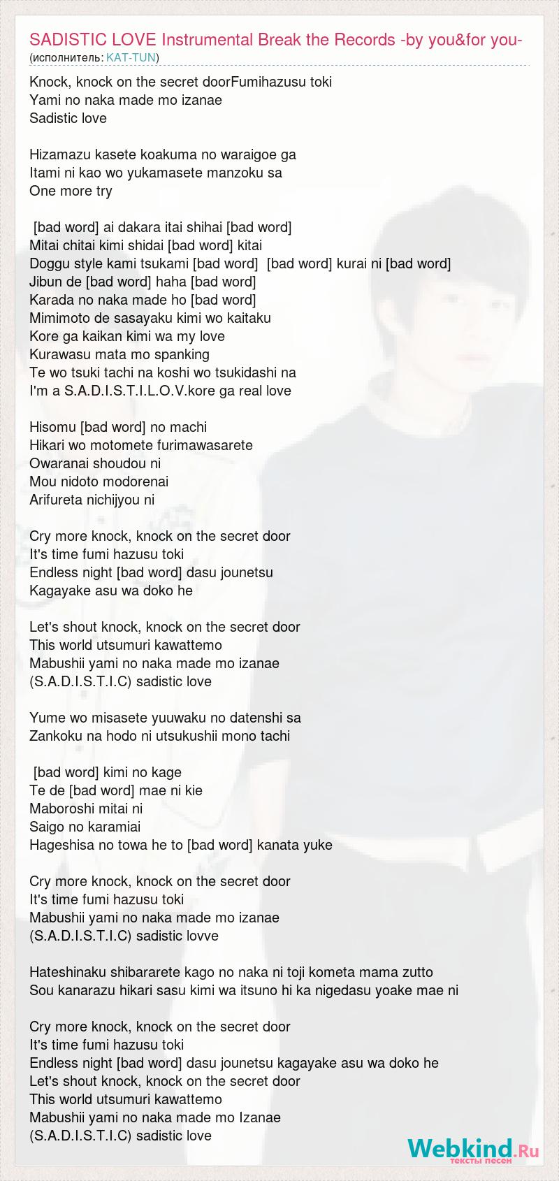 Knock, knock on the secret doorFumihazusu toki Yami no naka made mo izanae Sadistic love Hizamazu kasete koakuma no waraigoe ga Itami ni kao wo yukamasete manzoku sa One more try [bad word] ai dakara itai shihai [bad word] Mitai chitai kimi shidai [bad word] kitai Doggu style kami tsukami [bad word] [bad word] kurai ni [bad word] Jibun de [bad word] haha [bad word] Karada no naka made ho [bad word] Mimimoto de sasayaku kimi wo kaitaku Kore ga kaikan kimi wa my love Kurawasu mata mo spanking Te wo tsuki tachi na koshi wo tsukidashi na I'm a S.A.D.I.S.T.I.L.O.V.kore ga real love Hisomu [bad word] no machi Hikari wo motomete furimawasarete Owaranai shoudou ni Mou nidoto modorenai Arifureta nichijyou ni Cry more knock, knock on the secret door It's time fumi hazusu toki Endless night [bad word] dasu jounetsu Kagayake asu wa doko he Let's shout knock, knock on the secret door This world utsumuri kawattemo Mabushii yami no naka made mo izanae (S.A.D.I.S.T.I.C) sadistic love Yume wo misasete yuuwaku no datenshi sa Zankoku na hodo ni utsukushii mono tachi [bad word] kimi no kage Te de [bad word] mae ni kie Maboroshi mitai ni Saigo no karamiai Hageshisa no towa he to [bad word] kanata yuke Cry more knock, knock on the secret door It's time fumi hazusu toki Mabushii yami no naka made mo izanae (S.A.D.I.S.T.I.C) sadistic lovve Hateshinaku shibararete kago no naka ni toji kometa mama zutto Sou kanarazu hikari sasu kimi wa itsuno hi ka nigedasu yoake mae ni Cry more knock, knock on the secret door It's time fumi hazusu toki Endless night [bad word] dasu jounetsu kagayake asu wa doko he Let's shout knock, knock on the secret door This world utsumuri kawattemo Mabushii yami no naka made mo Izanae (S.A.D.I.S.T.I.C) sadistic love