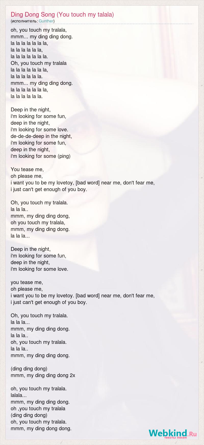 oh, you touch my tralala, mmm... my ding ding dong. la la la la la la la, la la la la la la, la la la la la la la. Oh, you touch my tralala la la la la la la la, la la la la la la. mmm... my ding ding dong. la la la la la la la, la la la la la la. Deep in the night, i'm looking for some fun, deep in the night, i'm looking for some love. de-de-de-deep in the night, i'm looking for some fun, deep in the night, i'm looking for some (ping) You tease me, oh please me, i want you to be my lovetoy, [bad word] near me, don't fear me, i just can't get enough of you boy. Oh, you touch my tralala. la la la.. mmm, my ding ding dong, oh you touch my tralala, mmm, my ding ding dong. la la la... Deep in the night, i'm looking for some fun, deep in the night, i'm looking for some love. you tease me, oh please me, i want you to be my lovetoy. [bad word] near me, don't fear me, i just can't get enough of you boy. Oh, you touch my tralala. la la la... mmm, my ding ding dong. la la la.. oh, you touch my tralala. la la la.. mmm, my ding ding dong. (ding ding dong) mmm, my ding ding dong 2x oh, you touch my tralala. lalala... mmm, my ding ding dong. oh ,you touch my tralala (ding ding dong) oh, you touch my tralala. mmm, my ding dong dong.