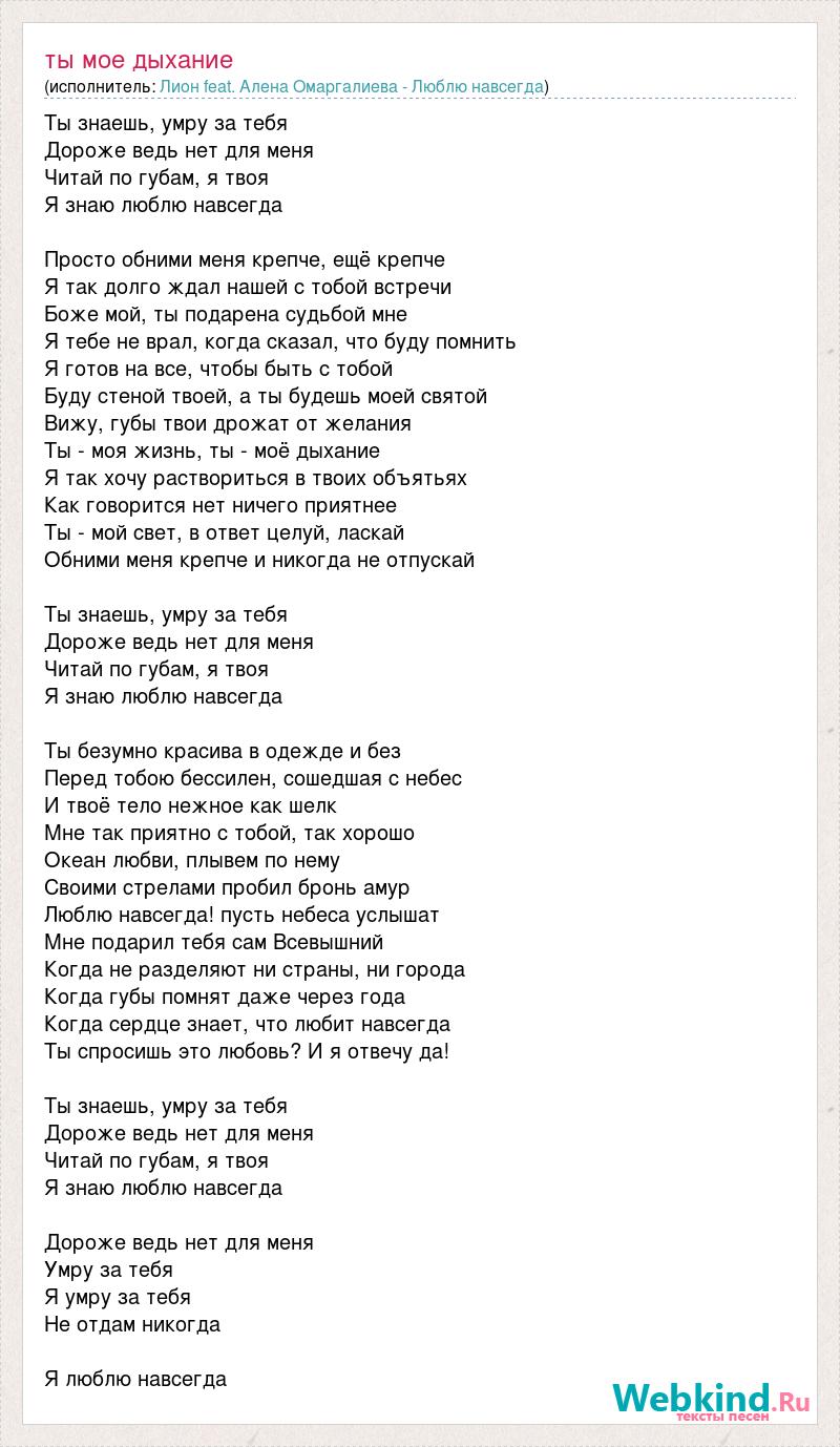 Ты знаешь, умру за тебя Дороже ведь нет для меня Читай по губам, я твоя Я знаю люблю навсегда Просто обними меня крепче, ещё крепче Я так долго ждал нашей с тобой встречи Боже мой, ты подарена судьбой мне Я тебе не врал, когда сказал, что буду помнить Я готов на все, чтобы быть с тобой Буду стеной твоей, а ты будешь моей святой Вижу, губы твои дрожат от желания Ты - моя жизнь, ты - моё дыхание Я так хочу раствориться в твоих объятьях Как говорится нет ничего приятнее Ты - мой свет, в ответ целуй, ласкай Обними меня крепче и никогда не отпускай Ты знаешь, умру за тебя Дороже ведь нет для меня Читай по губам, я твоя Я знаю люблю навсегда Ты безумно красива в одежде и без Перед тобою бессилен, сошедшая с небес И твоё тело нежное как шелк Мне так приятно с тобой, так хорошо Океан любви, плывем по нему Своими стрелами пробил бронь амур Люблю навсегда! пусть небеса услышат Мне подарил тебя сам Всевышний Когда не разделяют ни страны, ни города Когда губы помнят даже через года Когда сердце знает, что любит навсегда Ты спросишь это любовь? И я отвечу да! Ты знаешь, умру за тебя Дороже ведь нет для меня Читай по губам, я твоя Я знаю люблю навсегда Дороже ведь нет для меня Умру за тебя Я умру за тебя Не отдам никогда Я люблю навсегда