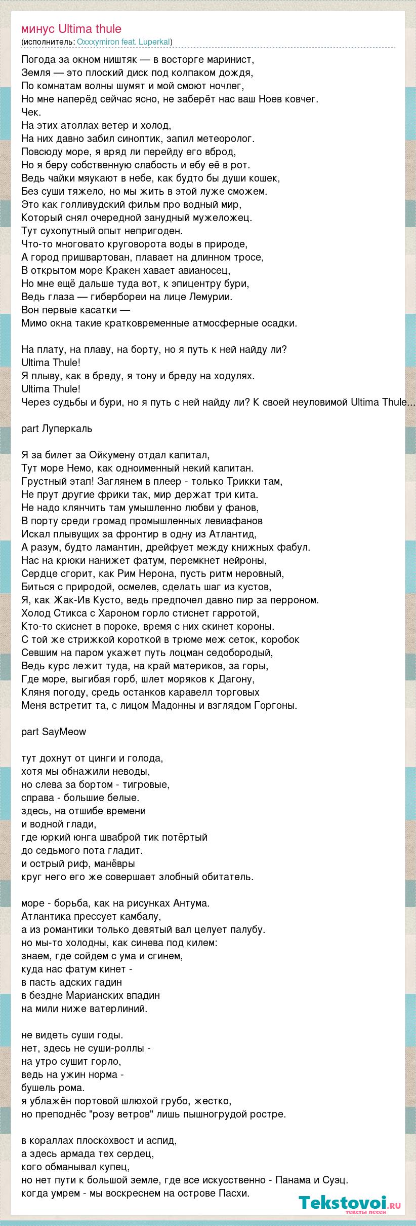 Погода за окном ништяк — в восторге маринист, Земля — это плоский диск под колпаком дождя, По комнатам волны шумят и мой смоют ночлег, Но мне наперёд сейчас ясно, не заберёт нас ваш Ноев ковчег. Чек. На этих атоллах ветер и холод, На них давно забил синоптик, запил метеоролог. Повсюду море, я вряд ли перейду его вброд, Но я беру собственную слабость и ебу её в рот. Ведь чайки мяукают в небе, как будто бы души кошек, Без суши тяжело, но мы жить в этой луже сможем. Это как голливудский фильм про водный мир, Который снял очередной занудный мужеложец. Тут сухопутный опыт непригоден. Что-то многовато круговорота воды в природе, А город пришвартован, плавает на длинном тросе, В открытом море Кракен хавает авианосец, Но мне ещё дальше туда вот, к эпицентру бури, Ведь глаза — гибербореи на лице Лемурии. Вон первые касатки — Мимо окна такие кратковременные атмосферные осадки. На плату, на плаву, на борту, но я путь к ней найду ли? Ultima Thule! Я плыву, как в бреду, я тону и бреду на ходулях. Ultima Thule! Через судьбы и бури, но я путь с ней найду ли? К своей неуловимой Ultima Thule... part Луперкаль Я за билет за Ойкумену отдал капитал, Тут море Немо, как одноименный некий капитан. Грустный этап! Заглянем в плеер - только Трикки там, Не прут другие фрики так, мир держат три кита. Не надо клянчить там умышленно любви у фанов, В порту среди громад промышленных левиафанов Искал плывущих за фронтир в одну из Атлантид, А разум, будто ламантин, дрейфует между книжных фабул. Нас на крюки нанижет фатум, перемкнет нейроны, Сердце сгорит, как Рим Нерона, пусть ритм неровный, Биться с природой, осмелев, сделать шаг из кустов, Я, как Жак-Ив Кусто, ведь предпочел давно пир за перроном. Холод Стикса с Хароном горло стиснет гарротой, Кто-то скиснет в пороке, время с них скинет короны. С той же стрижкой короткой в трюме меж сеток, коробок Севшим на паром укажет путь лоцман седобородый, Ведь курс лежит туда, на край материков, за горы, Где море, выгибая горб, шлет моряков к Дагону, Кляня погоду, средь останков каравелл торговых Меня встретит та, с лицом Мадонны и взглядом Горгоны. part SayMeow тут дохнут от цинги и голода, хотя мы обнажили неводы, но слева за бортом - тигровые, справа - большие белые. здесь, на отшибе времени и водной глади, где юркий юнга шваброй тик потёртый до седьмого пота гладит. и острый риф, манёвры круг него его же совершает злобный обитатель. море - борьба, как на рисунках Антума. Атлантика прессует камбалу, а из романтики только девятый вал целует палубу. но мы-то холодны, как синева под килем: знаем, где сойдем с ума и сгинем, куда нас фатум кинет - в пасть адских гадин в бездне Марианских впадин на мили ниже ватерлиний. не видеть суши годы. нет, здесь не суши-роллы - на утро сушит горло, ведь на ужин норма - бушель рома. я ублажён портовой шлюхой грубо, жестко, но преподнёс "розу ветров" лишь пышногрудой ростре. в кораллах плоскохвост и аспид, а здесь армада тех сердец, кого обманывал купец, но нет пути к большой земле, где все искусственно - Панама и Суэц. когда умрем - мы воскреснем на острове Пасхи.